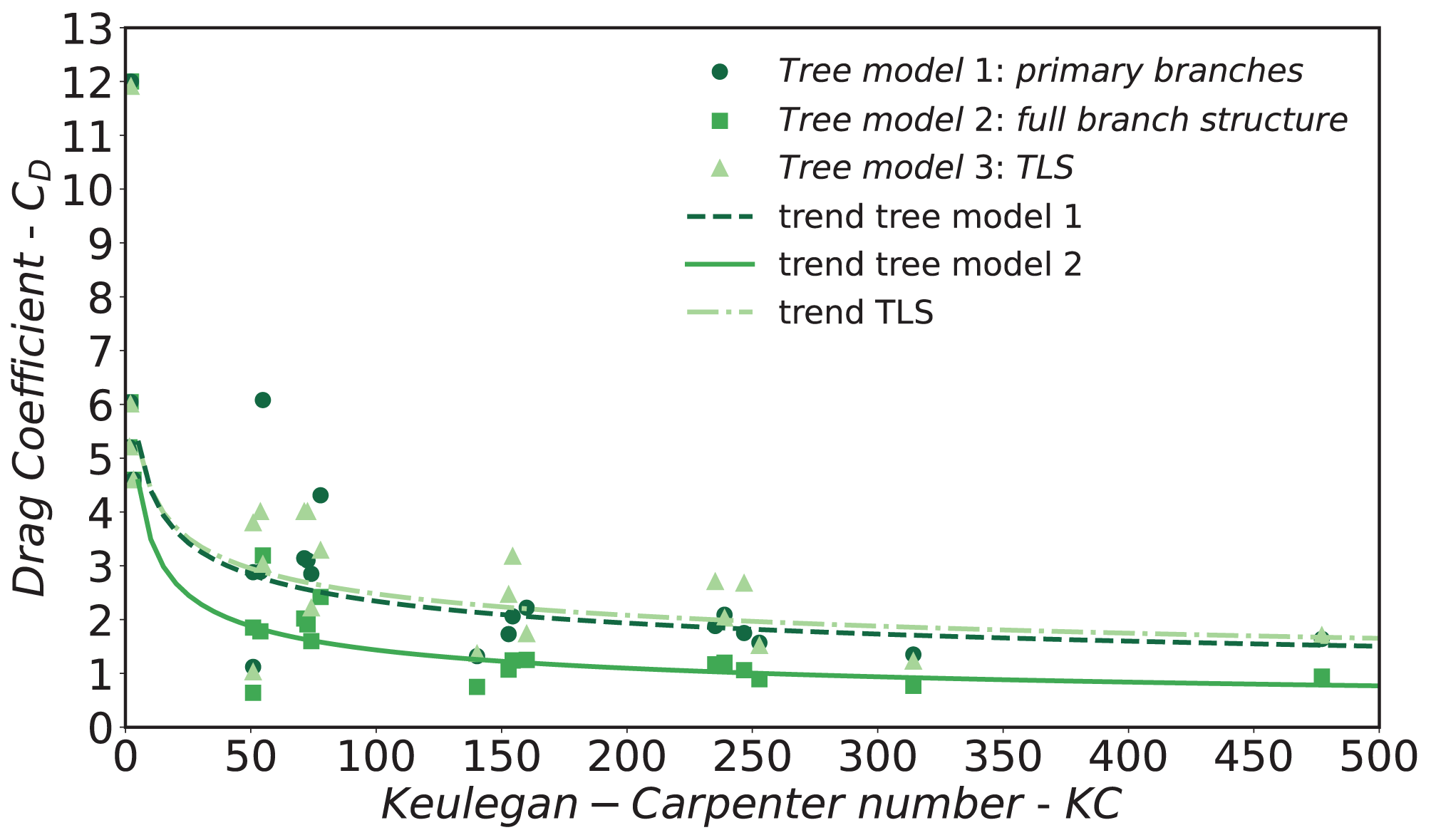 The bulk drag coefficient is an important, but an uncertain parameter (Kobayashi et al., 1993), as it generally accounts for the neglected processes. For example, we usually assume rigid cylinders, thus neglecting vegetation motion, which influences the relative velocity. Obviously, this becomes less valid for relatively flexible vegetation and can influence the wave attenuation by these fields. Furthermore, simplifications of vegetation geometry can also affect the wave attenuation processes. Nevertheless, several studies reveal relations between the bulk drag coefficient and dimensionless hydraulic parameters, such as the Reynolds number, Re (e.g., Hu et al., 2014) and the Keulegan-Carpenter number, KC, (e.g., Jadhav et al., 2013). Both Re and KC are predictors for the wake structures behind the vegetation (Sumer and Fredsoe, 1998). KC is also a measure for the relative importance between drag and inertia. These studies generally show that CD decreases with increasing KC and Re. In addition, other studies find better relations with non-dimensional parameters containing also vegetation characteristics such as the vegetation submergence ratio (Mendez and Losada, 2004) and the spacing between cylinders (Suzuki, 2011). These relations make it possible to chose a value for the bulk drag coefficient accordingly. In the case of woody vegetation with enough spacing between branches without motion, one can expect the CD values to be similar to that of rigid vertical cylinders, which holds a nearly constant value of ≈ 1.0 to 1.2 in the sub-critical flow regime (103 ≤ Re ≤ 105) (Sumer and Fredsoe, 1998; van Wesenbeeck et al., 2022).