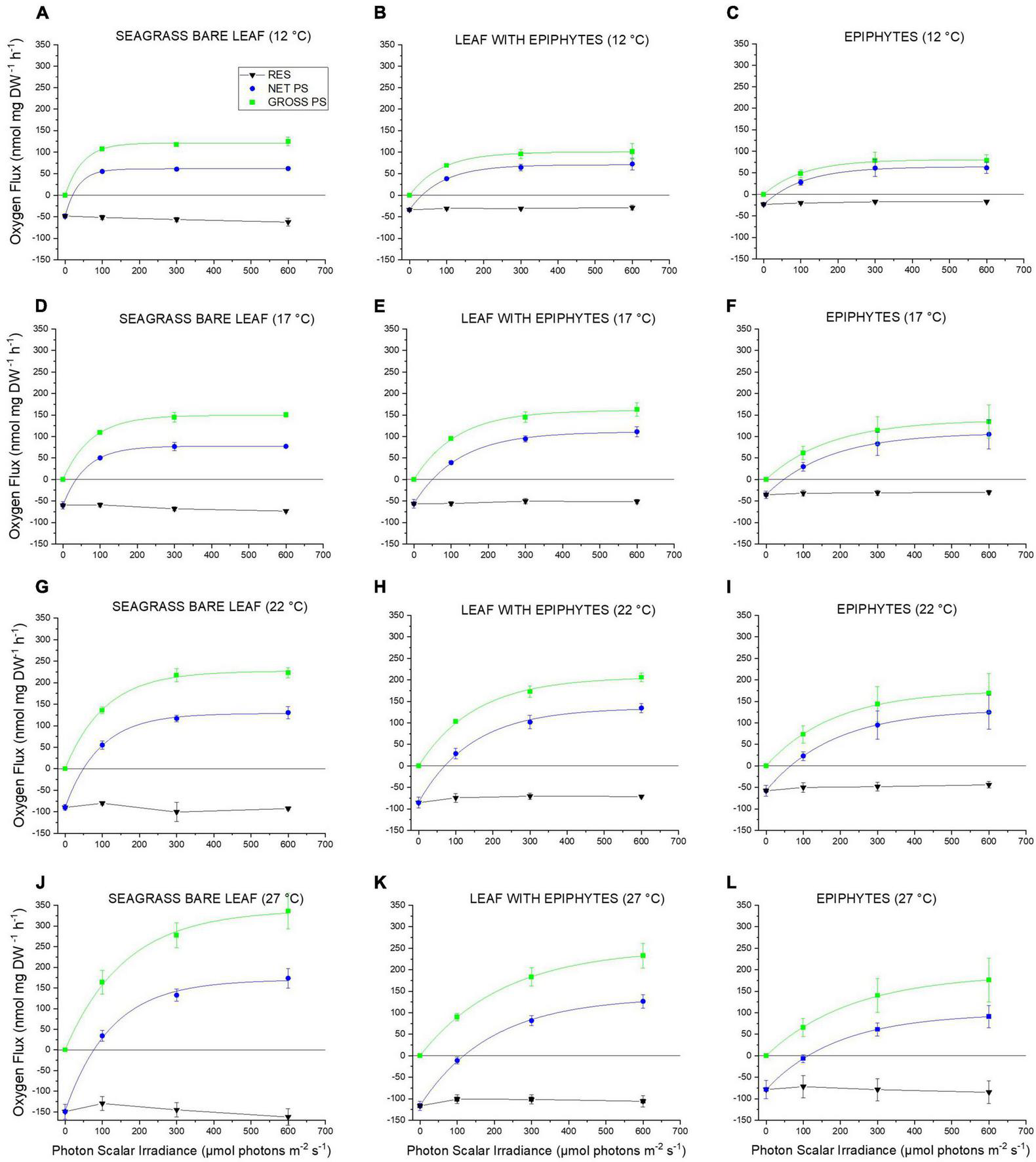Figure 1. (A–L) Respiration, net and gross O2 production rates as a function of incident photon scalar irradiance for Z. marina L. leaves with and without epiphytes, as well as, for epiphytes originating from Z. marina L. leaves. The respiration, net and gross photosynthesis rates were measured for photon scalar irradiances (PAR, 400–700 nm) of 0, 100, 300, and 600 μmol photons m–2 s–1 and temperatures of 12, 17, 22, and 27°C. Black symbols and lines shows respiration. Blue symbols and lines show net photosynthesis. Zero net O2 production (Y = 0) indicates the compensation photon irradiance of the seagrass leaves and epiphytes. Green symbols and lines show gross photosynthesis. Symbols with error bars represent mean values ± SEM; n = 4, biological replicates. All non-linear regression curve fits had an R2 of ≥ 0.99. Detailed information about our statistical models can be found in Supplementary Notes 1 and Supplementary Tables 1–24.