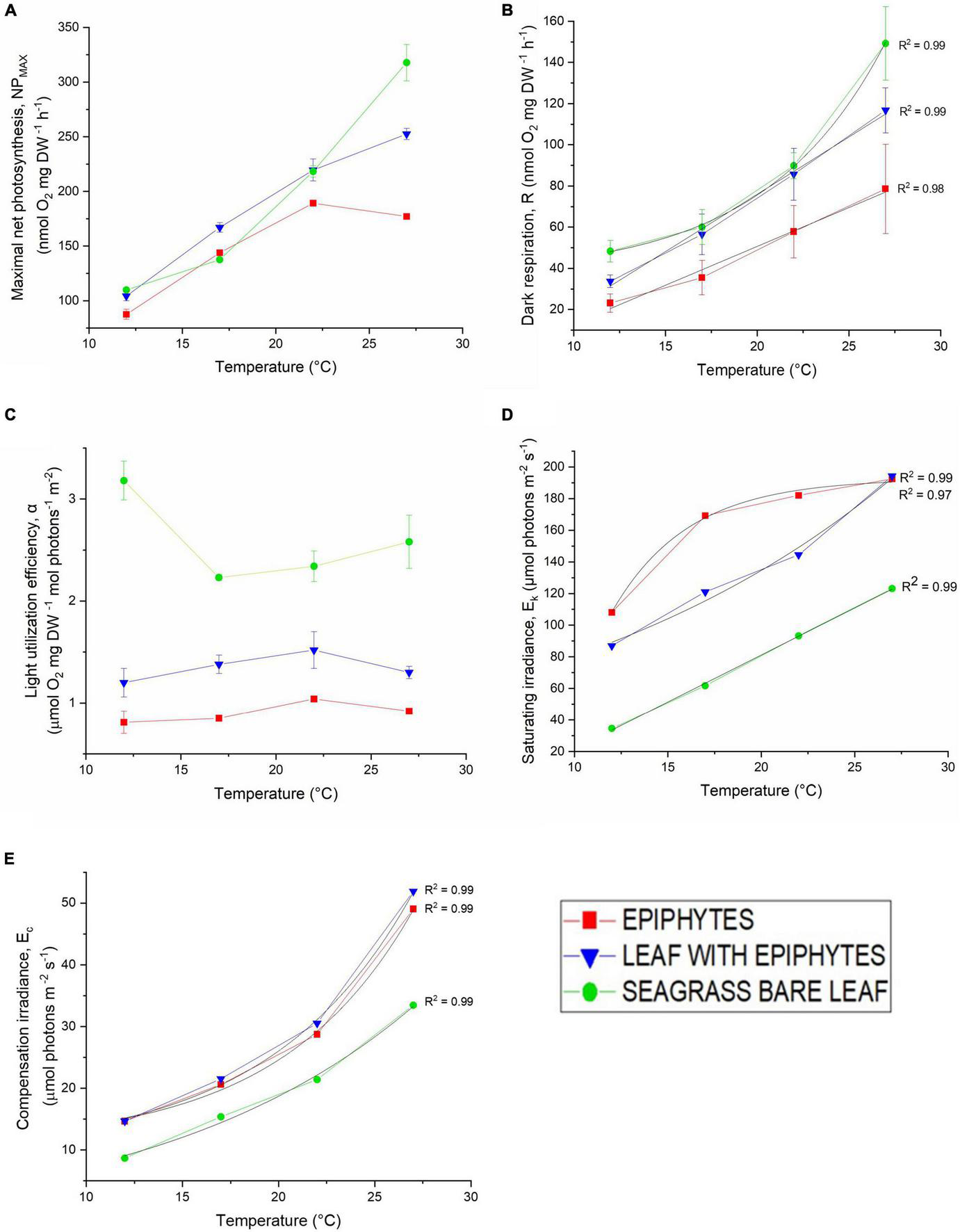 Figure 2. (A) Maximum photosynthesis rate (Pmax), (B) dark respiration (R), (C) light use efficiency (α), (D) photon scalar irradiance at the onset of photosynthesis saturation (Ek), and (E) compensation photon scalar irradiance (Ec) as a function of increasing temperature (12, 17, 22, and 27°C). Red symbols and lines represent epiphytes originating from Z. marina L. leaves. Blue symbols and lines represent Z. marina L. leaves with epiphytes. Green symbols and lines represent bare Z. marina L. leaves. Black lines show fitted exponential or linear function for the photosynthetic parameters: R, Ec and Ek; all with R2 ≥ 0.97. Symbols with error bars represent mean values ± SEM; n = 4, biological replicates.