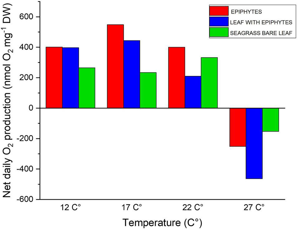 Figure 3. Diel oxygen budget as function of increasing temperatures (12, 17, 22, and 27°C), illustrating the daily net oxygen surplus of the leaf and epiphyte communities. Red bars represent epiphytes originating from Z. marina leaves. Blue bars represent Z. marina leaves with epiphytes. Green bars represent bare Z. marina leaves. The daily net oxygen production was calculated from the fitted exponential saturation models at increasing temperature (see Figure 1; all with a R2 ≥ 0.99) using an in situ measured 14h:10 h light/dark cycle (Staehr et al., 2018). The averaged exponential saturation fits were calculated from a biological replication of 4.