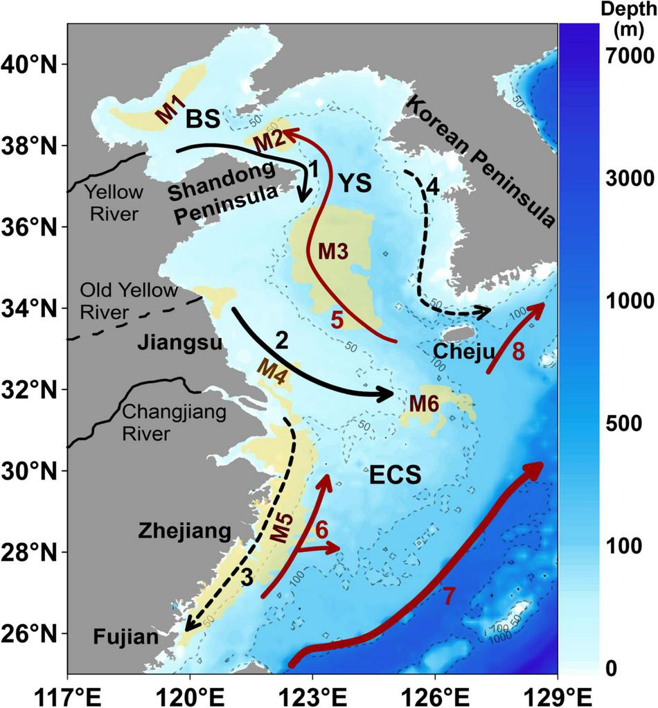 The water depth (m) and location of the Bohai Sea (BS), the Yellow Sea (YS), and the East China Sea (ECS); and the generalized currents and the location of mud areas in the eastern China marginal seas. The arrows with black and red lines denote the direction of ocean currents: the black ones refer to the BS Coastal Current (#1), the YS Coastal Current (#2), the ECS Coastal Current (#3) and the Western Korea Coastal Current (#4); the red ones refer to the YS Warm Current (#5), the Taiwan Warm Current (#6), the Kuroshio Current (#7), and the Tsushima Warm Current (#8). The width of lines represents current strength. Note that the arrows with solid lines represent currents that flow in the same direction all year round, while those with dotted lines indicate the direction in winter which flow in the opposite direction in summer. The yellow areas denote mud deposits: the central BS mud deposits (M1), the northern YS mud deposits (M2), the southern YS mud deposits (M3), the Changjiang River Estuary mud deposits (M4), the Fujian-Zhejiang coastal mud deposits (M5), and mud deposits southwest of the Cheju Island (M6). This figure is modified after Bian et al. (2013); Lian et al. (2016), and Yu et al. (2018).