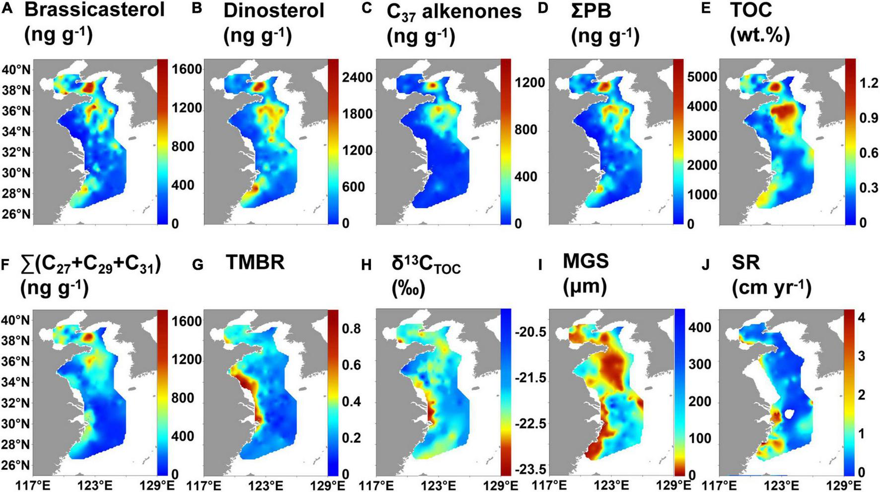 Distribution of lipid biomarkers and geographical variations in bulk properties of surface sediments in the eastern China marginal seas: (A) brassicasterol, (B) dinosterol, (C) C37 alkenones, (D) ΣPB, (E) TOC, (F) Σ(C27 + C29 + C31) n-alkanes, (G) terrestrial and marine biomarker ratio (TMBR), (H) δ13CTOC, (I) mean grain size (MGS), and (J) sedimentation rate (SR).