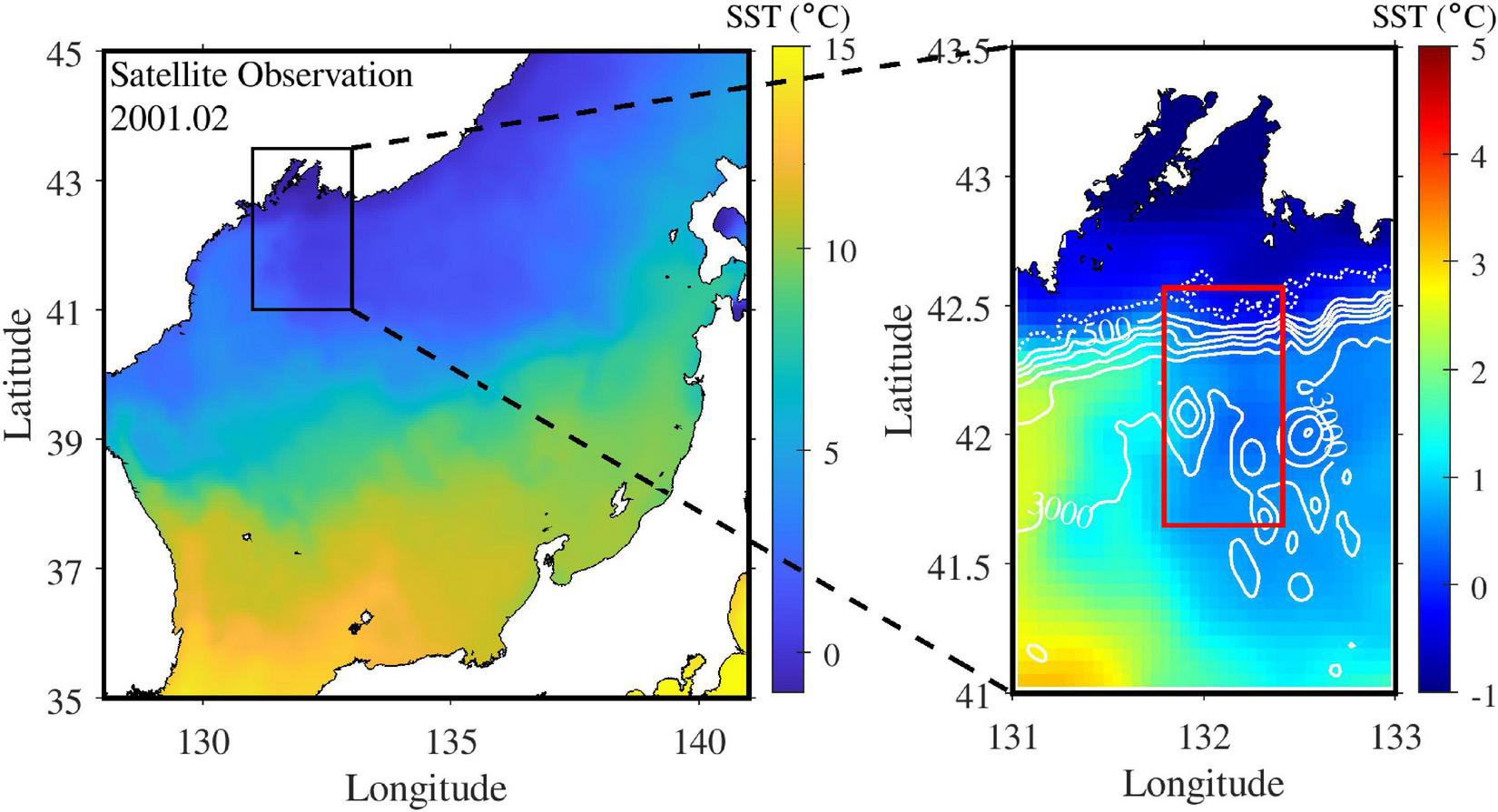 (Left panel) Sea surface temperature from satellite observation (OSTIA) in February 2001. (Right panel) Study area, including the continental shelf and slope south of Vladivostok. White solid lines represent isobaths. The model was idealized to mimic the actual topography inside the red rectangle in the right panel.