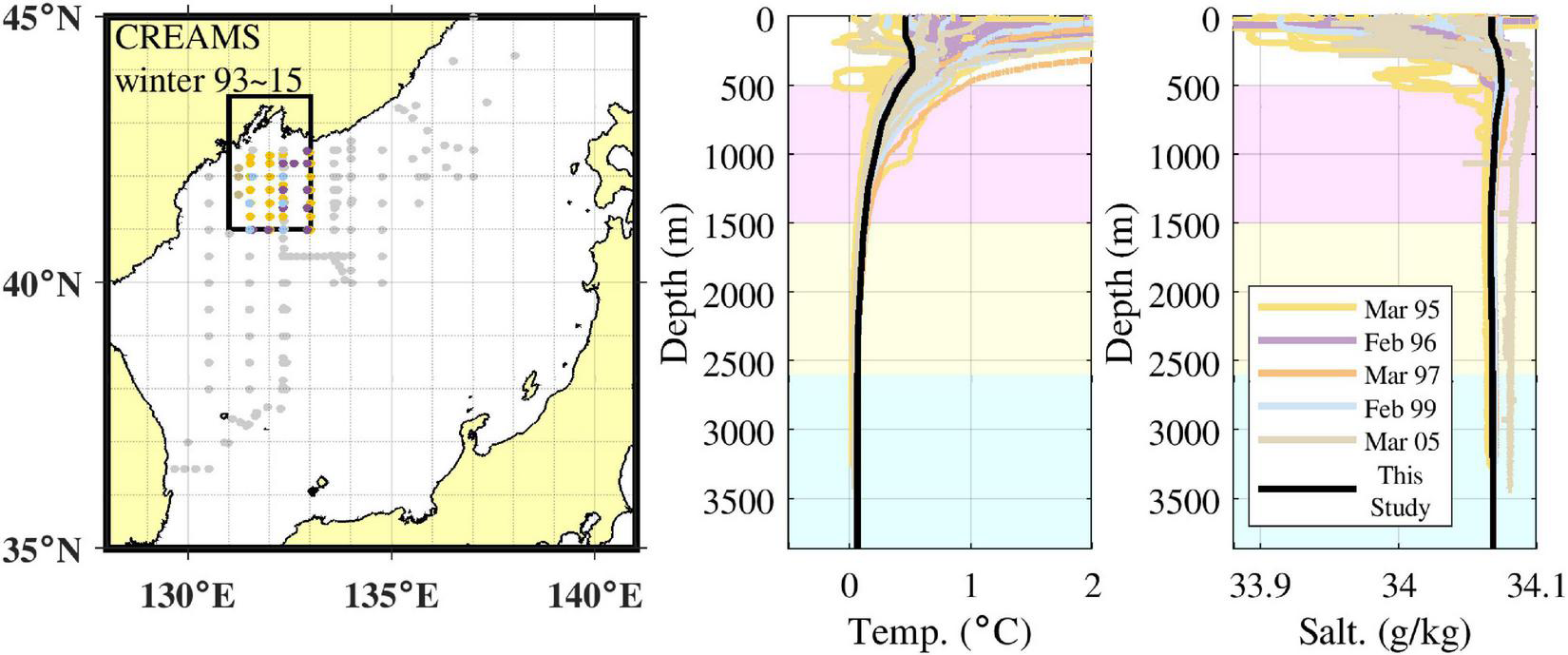 Deep water formation is crucial to the meridional circulation in the EJS (Han et al., 2020) and the oceans (Alley et al., 2003; Rahmstorf et al., 2015; Bellomo et al., 2021). It has been suggested that deep water formation occurs south of Vladivostok (Senjyu and Sudo, 1993; Kawamura and Wu, 1998).