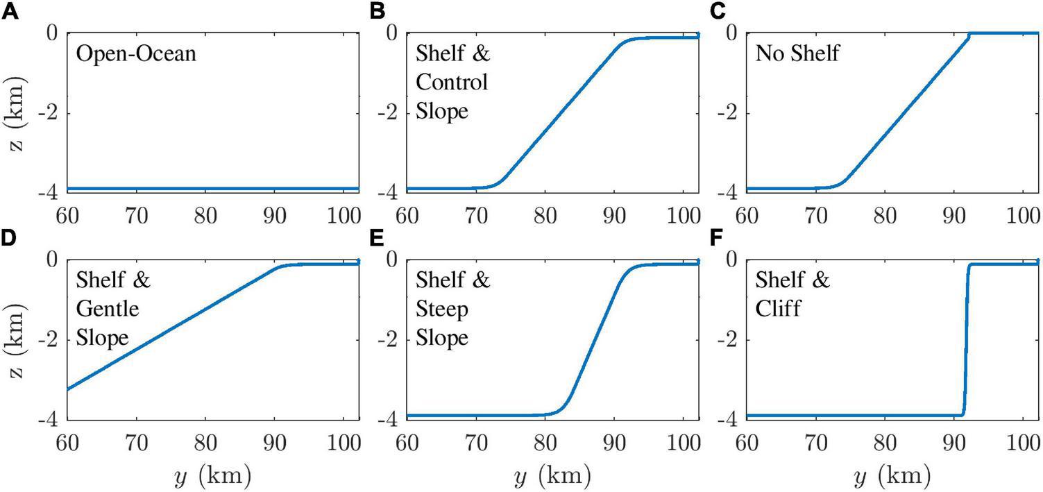 Side view of model topographies: (A) open ocean (OO), (B) shelf and control slope (SCS), (C) no shelf (NS), and shelf with (D) gentle slope (SGS), (E) steep slope (SSS), and (F) cliff (SC). Plots are confined to y ≥ 60 km.
