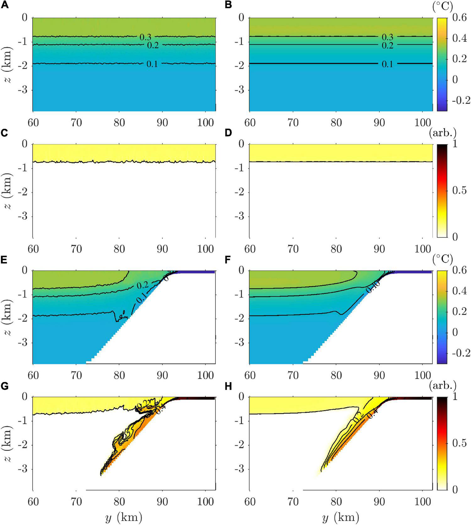 Meridional sections of the (A,B,E,F) potential temperature and (C,D,G,H) tracer concentration from the (A–D) OO and (E–H) SCS experiments. Left panels (A,C,E,G) are cross-sections at x = 25.6 km at the end step of day 20, and right panels (B,D,F,H) are zonally and temporally averaged values on day 20.