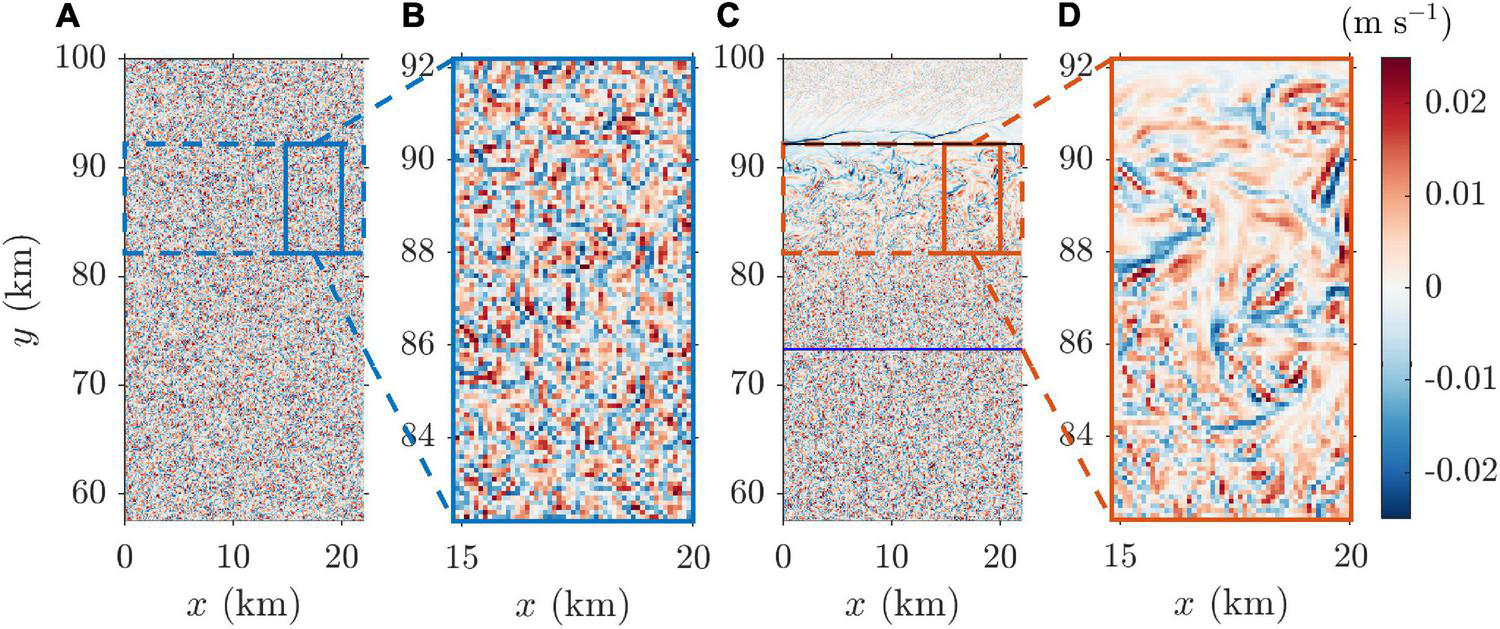 where C is an empirical constant equal to 73.7, κt is the thermal diffusivity, and B0 is the surface buoyancy flux. The estimated wavelength using our simulation parameters was approximately 844 m, which is comparable to that of the spectral analysis.
