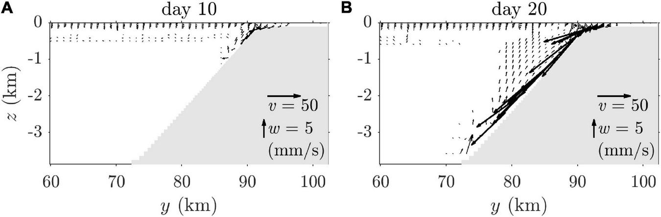 The mean vertical velocities in the OO experiment were zero. In contrast, in the SCS experiment, the plume on the continental slope exhibited a mean current. The dense water from the shelf flowed downward along the slope because of the density difference on day 10 (Figure 8A); the slope current became faster than 10 cm s–1 on day 20. A compensating flow over the slope current was formed simultaneously (Figure 8B). The overall flow structure and magnitude of the slope current were consistent with those in earlier studies (Tanaka and Akitomo, 2000).