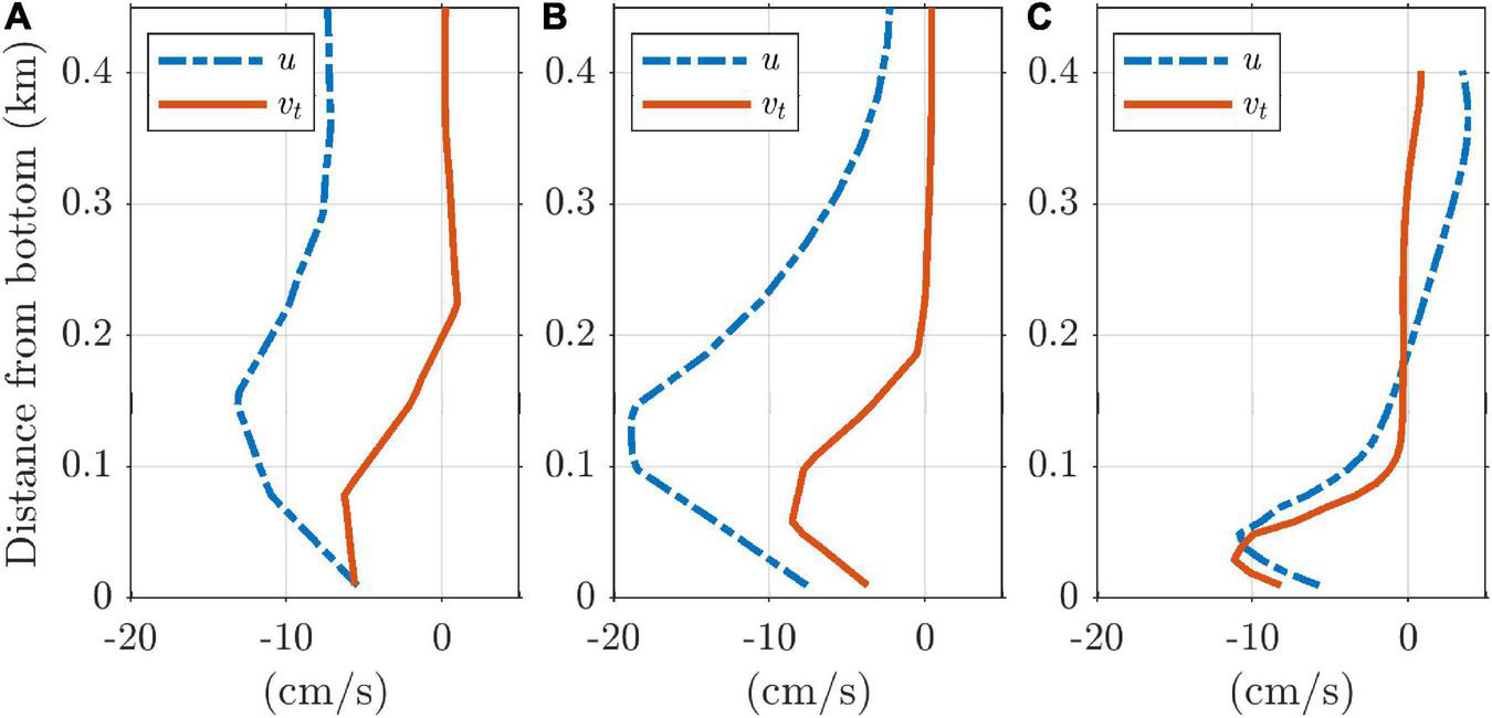 Profiles of zonal and downslope velocities near the slope bottom in the SCS experiment on day 20. (A)y = 80 km, (B)y = 85 km, (C)y = 90 km.