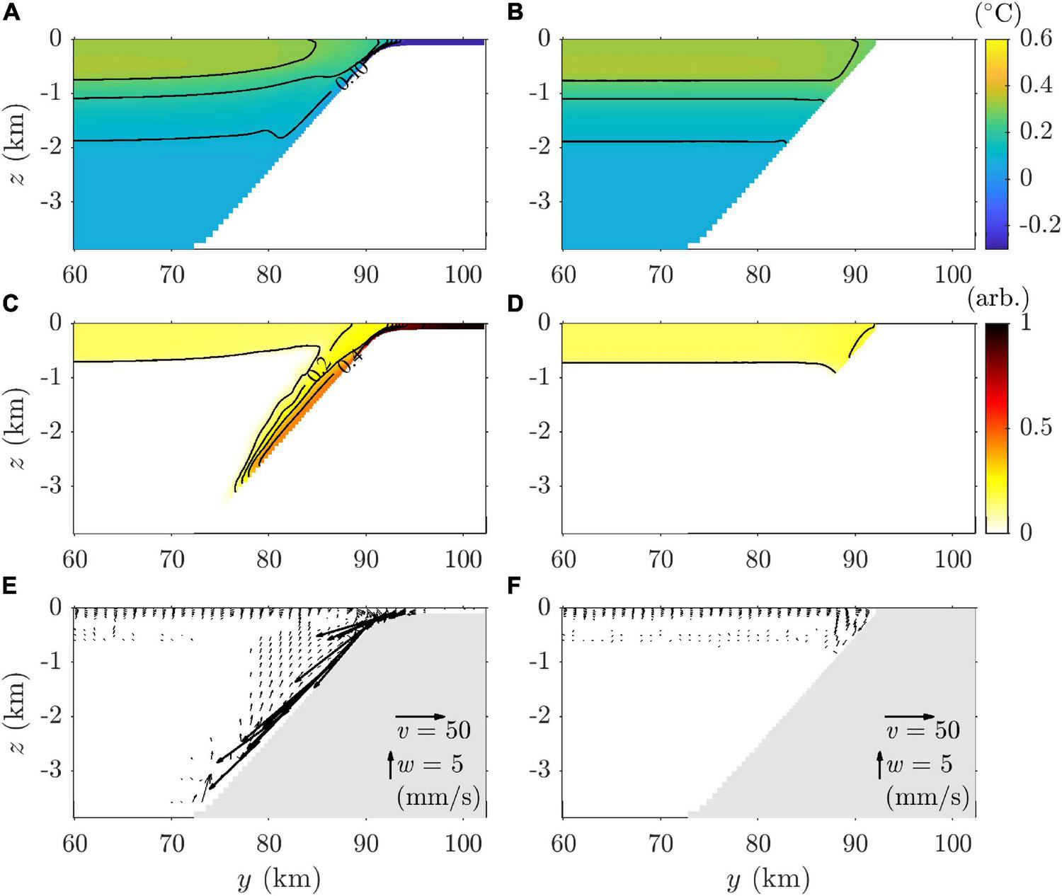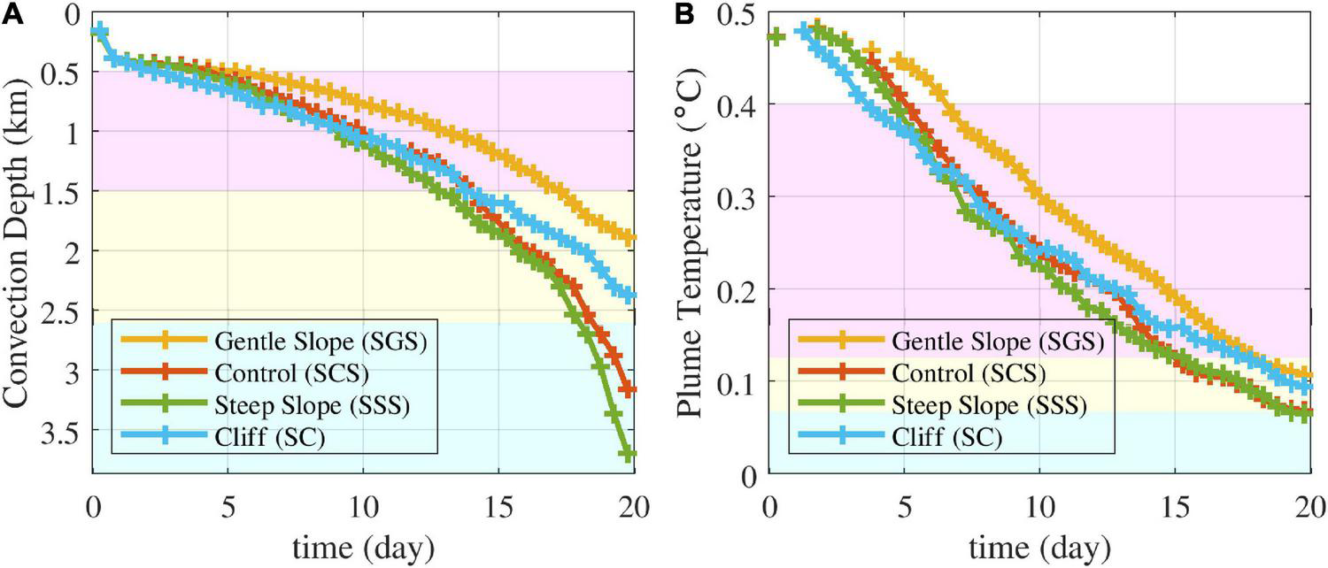 Because the plume flows down the slope forced by gravity (Ellison and Turner, 1959), the slope inclination is the main factor affecting the current speed. The temperature was similar in the SCS and SSS experiments, but the convection reached deeper in the SSS experiment after 15 days (Figure 13), suggesting that the amount of entrained background water was similar over the same period.