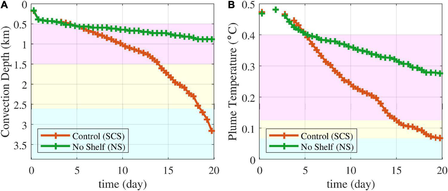 Nevertheless, the cooler coastal water in the NS experiment convected deeper than the mixed layer of the open ocean along the continental slope. The potential temperature of the convective-plume head, which reached 640 and 880 m on days 10 and 20 was 0.363 and 0.277°C, respectively (Figure 11).