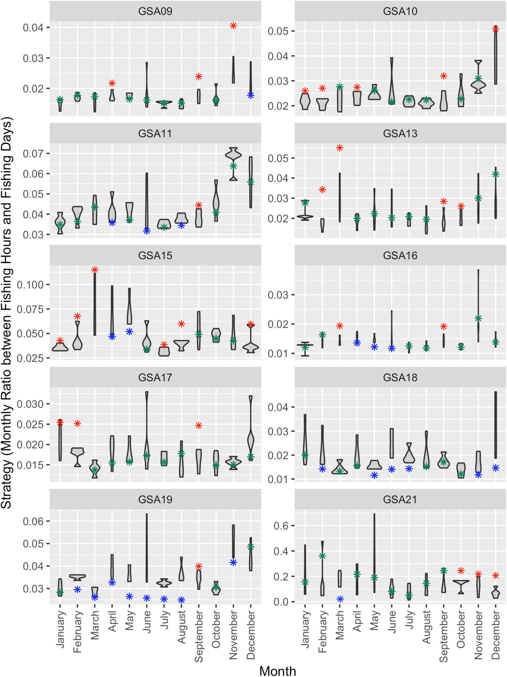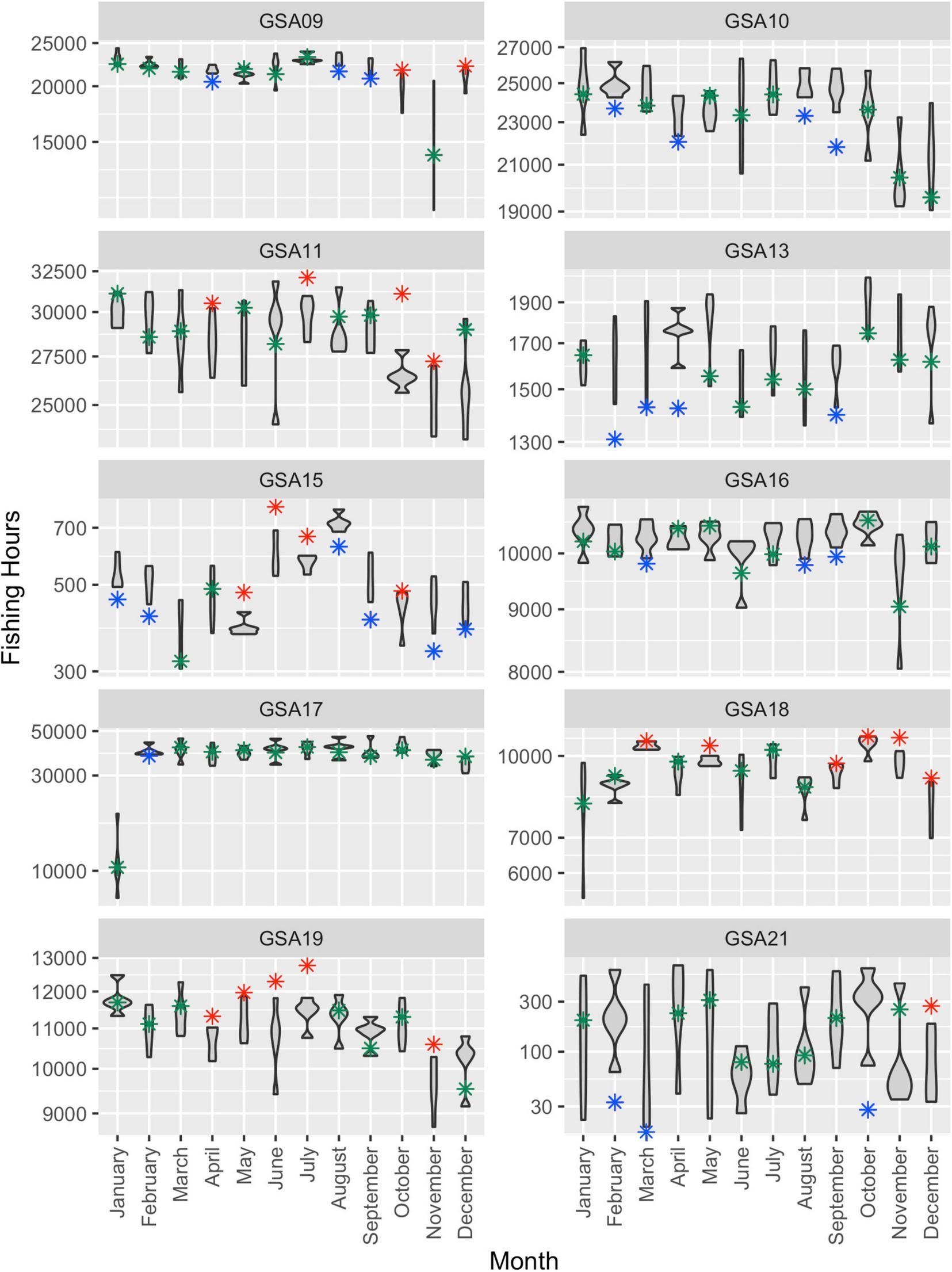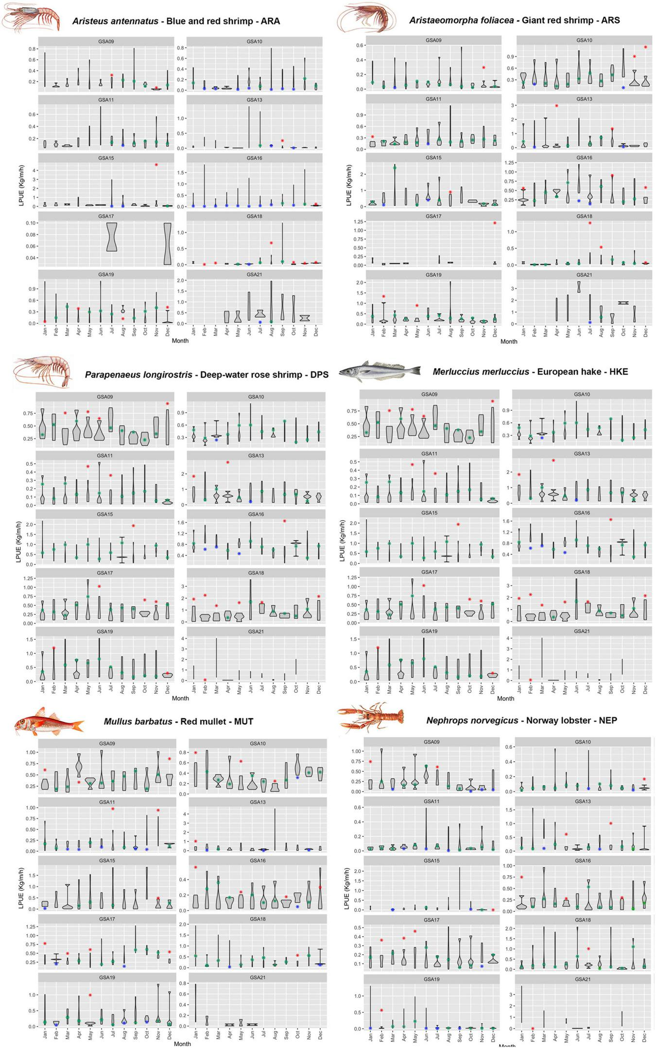 Supplementary Figure 1Violin plot of the values of LPUE per species, month and GSA. The values of the years 2015–2019 are represented by the violin, while those of the year 2020 (affected by the pandemic) are represented as red asterisks.