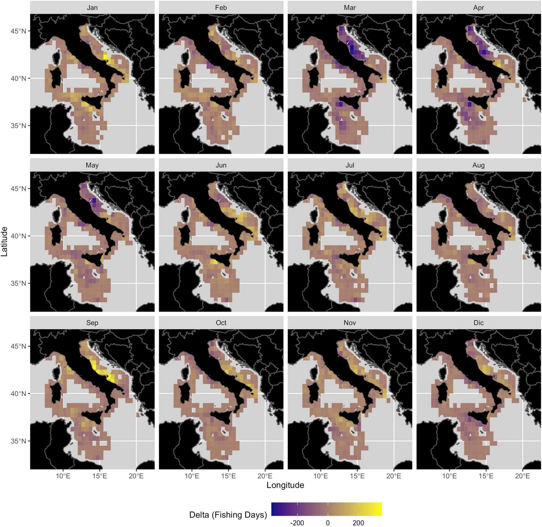 Recently, a growing number of researchers investigated the impacts of the shock induced by COVID-19 on fishing and fishers (FAO, 2020; Eugui et al., 2021; White et al., 2021). These studies documented varied effects on different aspects of fisheries. In some cases, as the countries implemented lockdown, many fishing activities faced complete shutdowns, e.g., in Namibia (Béné et al., 2015). Indeed, industrial fishing activity at global level has decreased by 6.5% at the end of April 2020 compared to April 2019 (Clavelle, 2020), while at regional level the reduction of activity was substantially different depending on both the local strategies and the spreading of the SARS-CoV-2. For instance, as highlighted in Coll et al. (2021), in the Exclusive Economic Zones of China the fishing activity decreased (overall in the year 2020) as much as 40%, while in Peru it dropped by 80%. At a smaller spatial scale, Coll et al. (2021) analyzed the effect of the reduction in fishing pressure in the Catalan Sea, Spanish Mediterranean. The authors showed that during the period of the lockdown (March–May 2020) fishing effort dropped by 34%, landings decreased by 49% and revenues declined by 39% in comparison with the same period in 2017–2019. On the other hand, Coll et al. (2021) did not detect a significant change in Landing-Per-Unit-of-Efforts (LPUEs). Similarly, Russo et al. (2021) by comparing the fishing activities in three periods (before, during, and after the lockdown) of 2019 and 2020 highlighted a reduction of about 50% of fishing effort in the Northern and Central Adriatic Sea. Before lockdown period the analysis showed a slight increase of the trawling activities at the Geographical Sub Area (GSA) 17 level in 2020, reflecting in a higher number of active vessels, days at sea, and, more in general, of the fishing effort. Moreover, the high-resolution maps of the difference of the fishing effort between 2019 and 2020 highlighted a similar distribution of the fishing grounds in the period before the lockdown, confirming the already pointed out non-random behavior of the fishers in the Northern and Central Adriatic Sea (Russo et al., 2021). By analyzing the data on landings, Russo et al. (2021) also pointed out a strong decrease in profits ranging from -30%, for the small-scale fisheries, to -85%, for the small bottom otter trawl, essentially as a consequence of the decrease in the fishing activity.