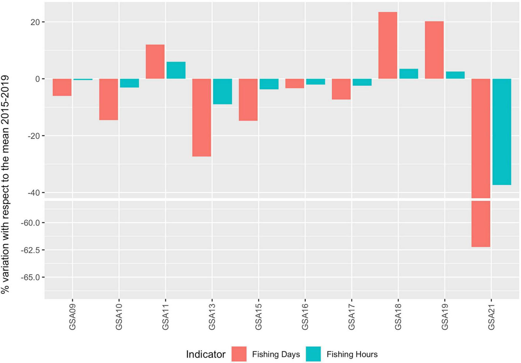 The restrictions also strongly changed the maritime traffic during the first half of 2020. March et al. (2021), using Automatic Identification System (AIS) data, provided a large-scale assessment on the global change in marine traffic revealing a general decline of 1.4%. When compared to the baselines, i.e., equivalent periods of 2019, the Western Mediterranean Sea was one the areas with the highest reduction in shipping activities (March et al., 2021). In particular, the number of vessels sharply decreased in the first days of mobility restrictions, reaching an overall median drop of 51% during the initial national lockdowns in Spain, France and Italy. Yet, after relaxing restrictions, the fishing vessels returned close to baseline values (March et al., 2021). This happened often very fast, with most of the fleets rebounding their activity from mid-July until mid-September (March et al., 2021).