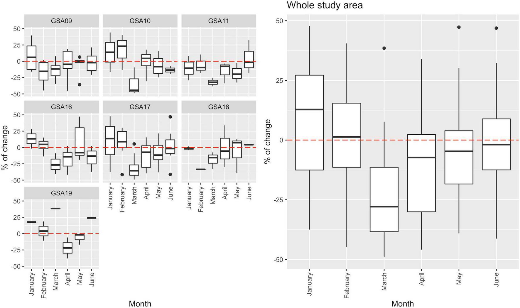 The data related to the total monthly landings of demersal species in a sample of the main ports of each GSA (Table 1) have been analyzed for the first 6 months of the years 2019 and 2020 (data for the second semester of the year 2020 were not available during the preparation of this paper), and compared in order to verify the effects of the COVID-19 shock on the production of the fleet.