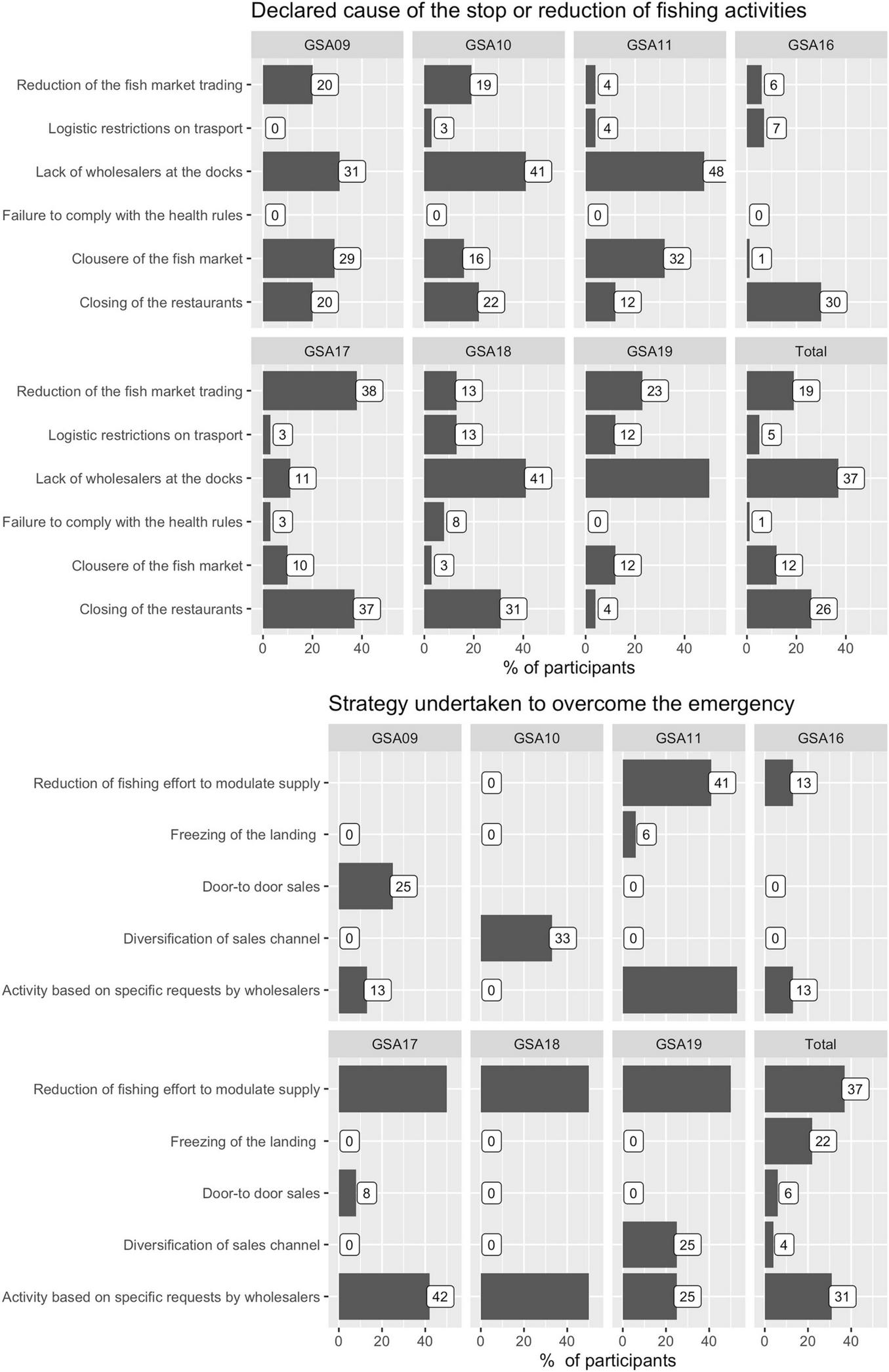 The market and economic drivers that indirectly amplified the effort variation during the lockdown and in the subsequent period have been assessed by administering a questionnaire to a representative vessel sample through a web platform. The sample was composed of 222 demersal trawlers randomly selected over the whole fleet. To establish whether the impact of the lockdown differed in the different areas, the sample was further stratified according to GSA, thus identifying 27 segments. The number of participating vessels is reported in Table 3 according to their GSA. The fleet segment of demersal trawlers in Italy account for about 2,149 vessels (European Commission et al., 2019), and the survey involved 10% of the whole fleet segment.