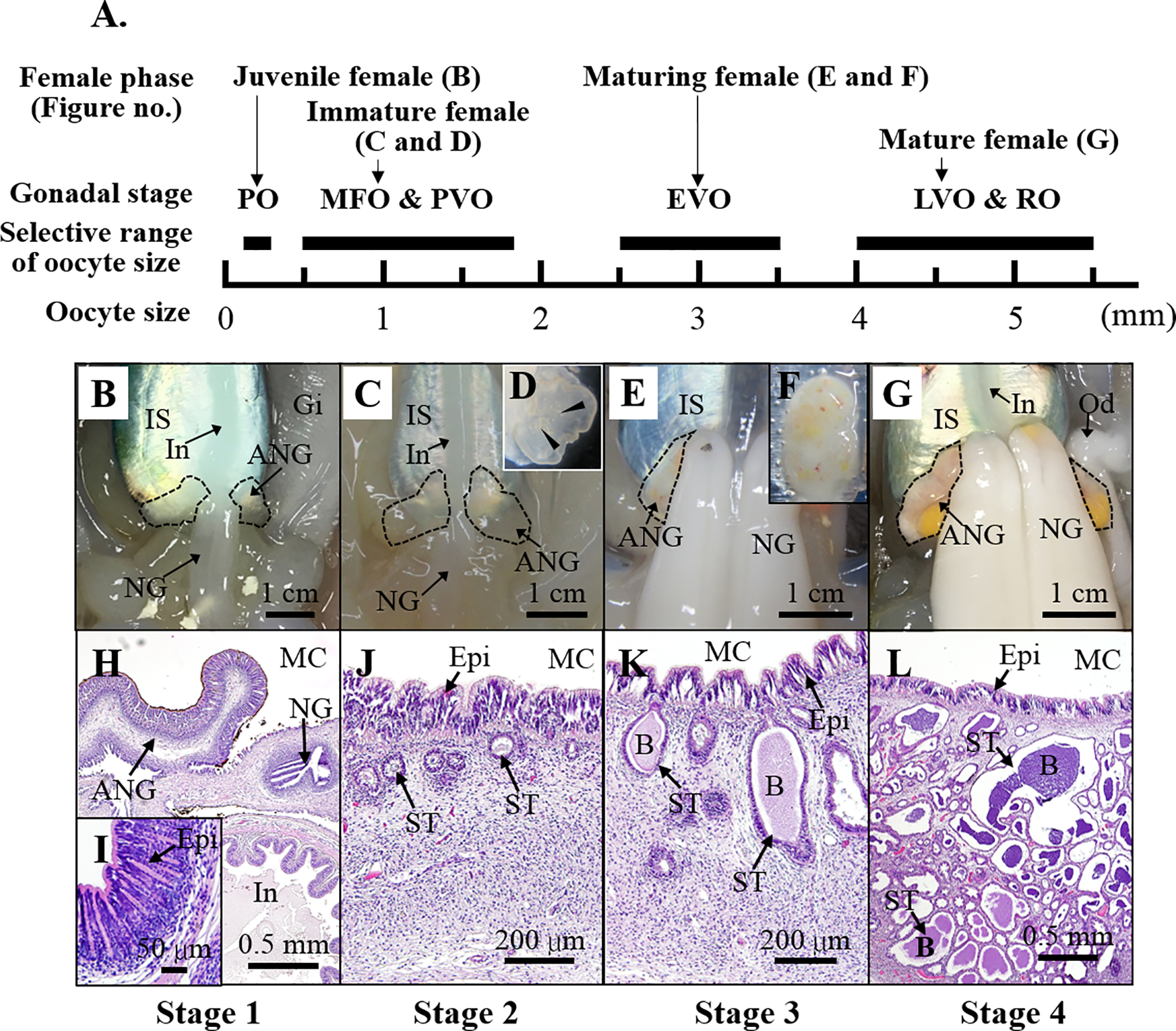 The characteristics of ANG during female squid maturation. (A) The profiles of female growth, including the juvenile female (primary oocyte stage), immature female (multiple follicular oocyte stage and previtellogenic oocyte stage), maturing female (early vitellogenic oocyte stage), and mature female (late vitellogenic oocyte stage and ripe oocytes). (B–G) Morphological changes during ANG growth. (B) juvenile squid with a colorless ANG (stage 1); (C, D) immature squid with a colorless ANG several white spots (stage 2); (E, F) maturing squid with a white/light-orange ANG (stage 3); (G) mature squid with a pigmented ANG (stage 4). (H–L) Histological changes during ANG growth. (H, I) juvenile squid with a colorless ANG without visible bacterial flora (stage 1); (J) immature squid with a colorless ANG with bacterial flora (stage 2); (K) maturing squid with a white/light-orange ANG with large numbers of bacterial flora (stage 3); (L) mature squid with a pigmented ANG with large numbers of bacterial flora (stage 4). PO, primary oocyte; MFO, multiple follicular oocyte; PVO, previtellogenic oocyte; EVO, early vitellogenic oocyte; LVO, late vitellogenic oocyte stage; RO, ripe oocyte; IS, ink sac; In, intestine; Gi, gill; NG, nidamental gland; ANG, accessory nidamental gland; Od, oviduct; MC, mantle cavity; Epi, epithelial cell; ST, secondary tubule; B, bacteria.