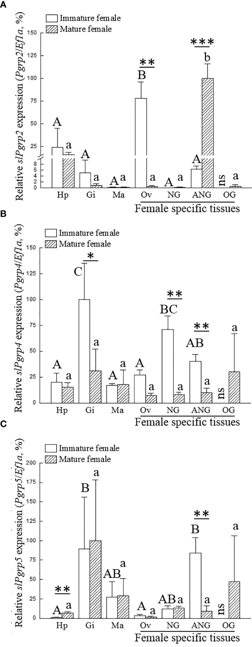 Expression of slPgrp transcripts in various tissues. The gonadal stage of female squid was distinguished by histology. Immature (n = 3; primary oocyte stage) and mature (n = 3; vitellogenic oocyte stage) females were used to analyze gene expression in different tissues. Three slPgrp genes were selected for analysis, including slPgrp2(A), slPgrp4(B), and slPgrp5(C). Different capital letters indicate significant differences between tissues in immature female (P < 0.05). Different lower-case letters indicate significant differences between tissues in mature female (P < 0.05). Asterisks indicate significant difference between the immature and mature females (*P < 0.05, **P < 0.01, and ***P < 0.001, respectively). Hp, hepatopancreas, Gi, gill; Ma, mantle (muscle); Ov, ovary; NG, nidamental gland; ANG, accessory nidamental gland; OG, oviductal gland; ns, no sample.
