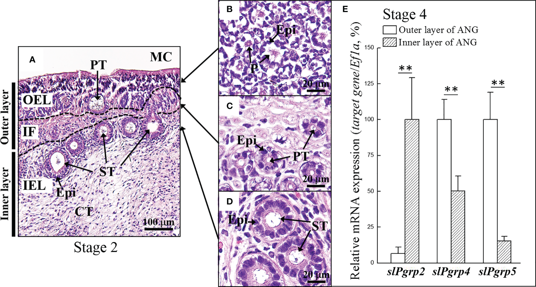 Expression of slPgrp transcripts in different layers of ANG. (A) The definition of outer and inner layer of ANG. (B, C) The outer layer of ANG was composed by outer epithelial cell layer and intermediate fiber layer, respectively. (D) The inner layer of ANG was composed by inner epithelial cell layer. The relative portion of outer and inner layer of ANGs from mature female squid (stage 4, n = 4) were isolated under a stereomicroscope and analyzed separately. (E) Expression levels of slPgrp2, slPgrp4, and slPgrp5 were analyzed by qPCR. **P < 0.01 comparing the outer and inner layer of ANGs. OEL, outer epithelial cell layer; IF, intermediate fiber layer; IEL, inner epithelial cell layer; MC, mantle cavity; CT, connective tissue; Epi, epithelial cell; PT, primary tubule; ST, secondary tubule; P, pore.