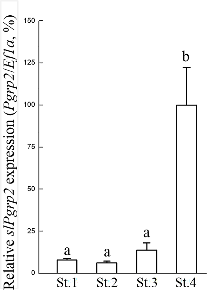 Gene expression profile of slPgrp2 during ANG growth. According to histology, four different stages of ANGs were used for gene expression analysis, including stage 1 (n = 4), stage 2 (n = 14), stage 3 (n = 12), and stage 4 (n = 9). The expression profile of slPgrp2 during ANG development was analyzed by qPCR. Different lower-case letters indicate significant differences between stages of ANGs (P < 0.05). St, stage.