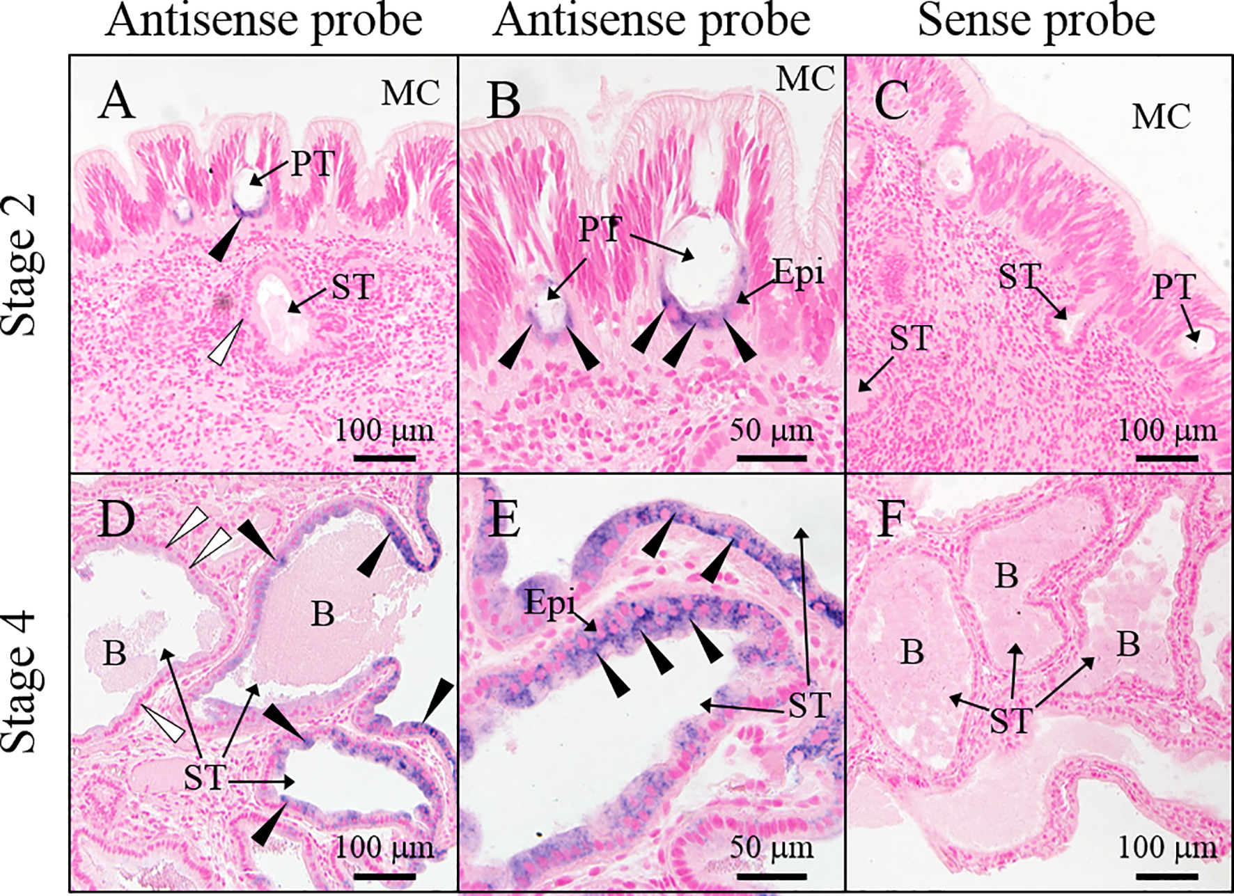 Location of slPgrp2 transcripts in ANG. (A, B)slPgrp2 transcripts were detected in epithelial cells of primary tubules in the ANG using an antisense probe in immature female squid (stage 2). (C) Background staining was evaluated using a sense probe for slPgrp2 in immature female squid (stage 2). (D, E)slPgrp2 transcripts were detected with an antisense probe in epithelial cells of secondary tubules of ANG in mature female squid (stage 4). (F) Background staining was evaluated using a sense probe for slPgrp2 in mature female squid (stage 4). Black arrowhead denotes slPgrp2 signal, and white arrowhead denotes areas without slPgrp2 signal in epithelial cells. B, bacteria; Epi, epithelial cells; MC, mantle cavity; PT, primary tubule; ST, secondary tubule.