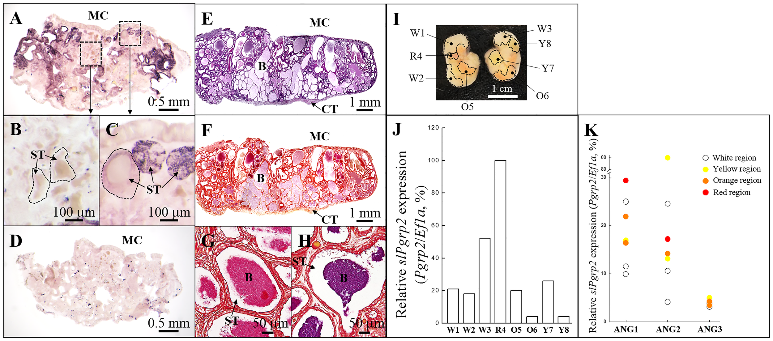 Expression of slPgrp2 transcripts in different areas of ANG in the mature female squid. (A–C)slPgrp2 mRNA expression of ANG was detected by an antisense probe in mature female squid (stage 4). (D) Background staining was evaluated using a sense probe for slPgrp2 in serial sections. (E, F) Histological characteristics and Gram staining of ANG in mature female squid, respectively. (G, H) Gram staining in different secondary tubules of ANG. (I) Different regions in ANG were distinguished by color and isolated under a stereomicroscope. Each color region was analyzed separately. (J) Expression of slPgrp2 mRNA was analyzed by qPCR in different colors regions, as shown in (I). (K) Four different colors of bacterial regions were detected and used for correlation with gene expression pattern: white, yellow, orange, and red. slPgrp2 mRNA expression showed high variability in areas with different regions, even between regions with the same color. Dash line in (B, C) denotes the border of secondary tubule. B, bacteria; MC, mantle cavity; ST, secondary tubule; W, white; R, red; Y, yellow; O, orange.