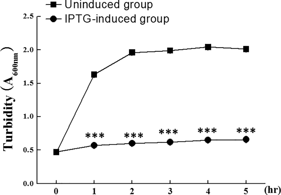 The effect of rslPGRP2 in bacterial growth. Recombinant slPGRP2 (rslPGRP2) was induced by the addition of IPTG. The potential effect of rslPGRP2 in bacterial growth was analyzed by growth rate of E. coli using turbidity assay (spectrophotometer absorbance at 600 nm). E.coli carrying an IPTG-inducible slVasa expression cassette were used as reference control to show that the vector did not negatively affect E. coli growth. Samples were collected at 1-hr intervals after IPTG addition in IPTG-induced group. E.coli without IPTG treatment (uninduced group) was used as a reference. The three asterisks indicate Student’s t-test (P < 0.001).