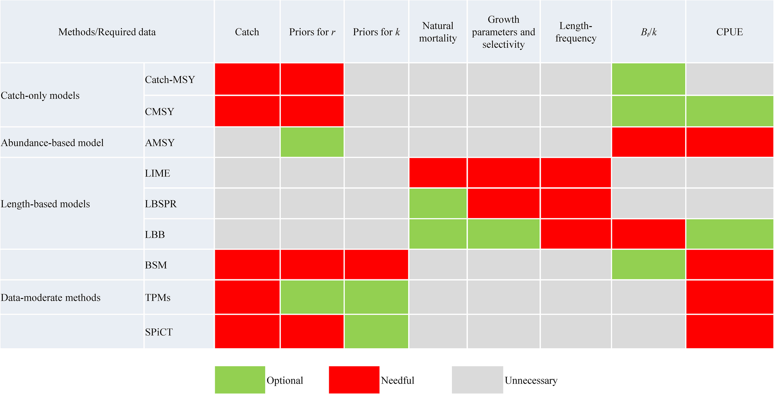 When possible, fishery management actions are based on estimates of current stock status and management targets produced from full age-structured stock assessment models (Wiedenmann et al., 2019), but most of the unassessed stocks lack data and commercial importance for a full age-based stock assessment (Bouch et al., 2021). In the world, more than 80% of the fisheries by numbers and about half of the catches have not been formally analyzed and evaluated due to limited data (FAO, 2020; Hilborn et al., 2020). This has led to the fast growth of data-poor evaluation methods (Doyen et al., 2017; Zhang et al., 2018; Hilborn et al., 2020; Pons et al., 2020; Lucena-Frédou et al., 2021). A variety of data-limited assessment methods (catch-based methods, length-based methods, and abundance-based methods) have been developed (that use simple models) to estimate stock status in relation to management reference points (Chrysafi and Kuparinen, 2016; Pons et al., 2020; Wang et al., 2020; Bouch et al., 2021; Lucena-Frédou et al., 2021). Given our findings, the data-poor method fills the gap (Table 3).