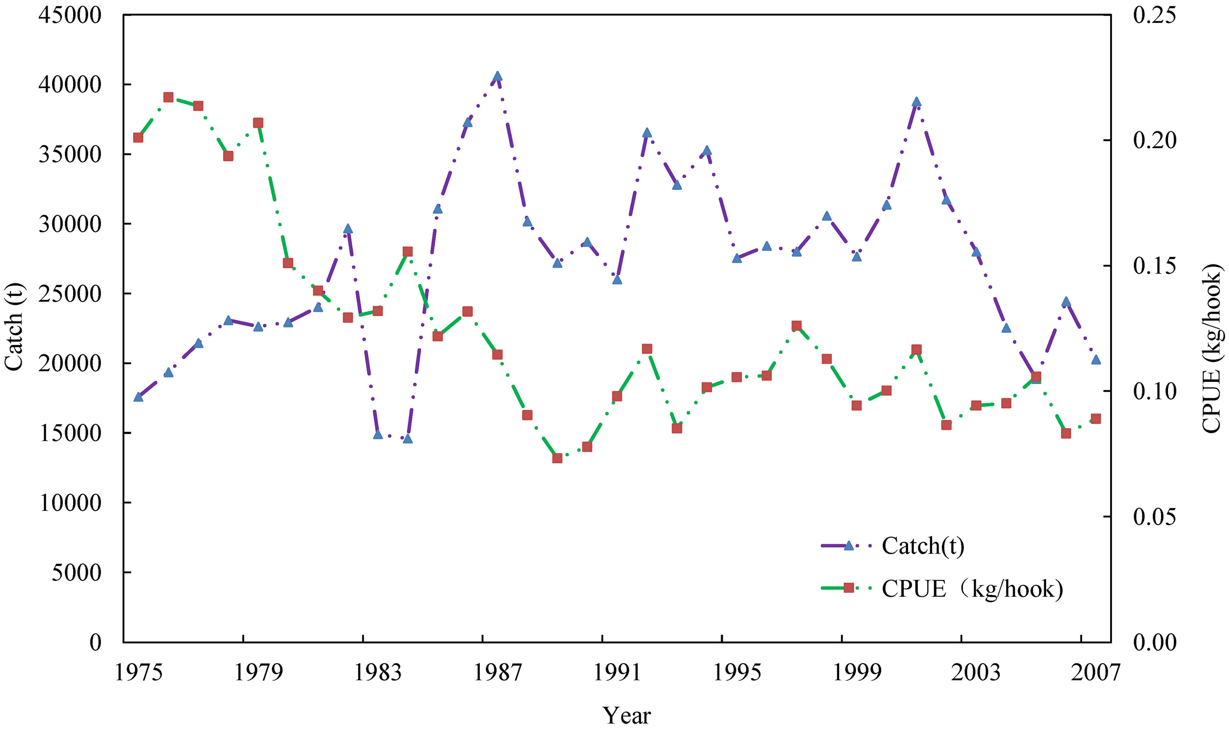 Statistical data of the catch and standardized catch per unit effort (CPUE) of the southern Atlantic albacore (Thunnus alalunga) fishery from 1975 to 2005.