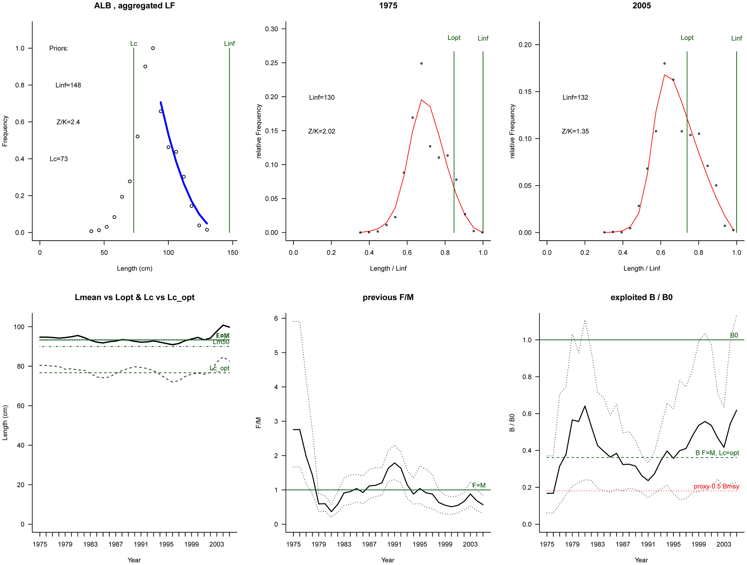 Graphical output of LBB for the southern Atlantic albacore (Thunnus alalunga) fishery (under the condition of setting Linf at 147.5 cm). The top left panel shows the accumulated length-frequency data used to estimate priors for Lc, Linf, and Z/K. The top middle and right panels show the length-frequency data for the first and last years in the time series. The bottom left panel shows Lmean (bold black curve) relative to Lopt and Lc (dashed black curve) relative to Lc_opt. The bottom middle panel shows relative fishing pressure F/M (black curve), with approximately 95% confidence limits (dotted curves). The bottom right panel shows relative biomass B/B0 (black curve) with approximately 95% confidence limits (dotted black curves), with an indication of a proxy for BMSY (green dashed line) and a proxy for 0.5 BMSY (red dotted line).