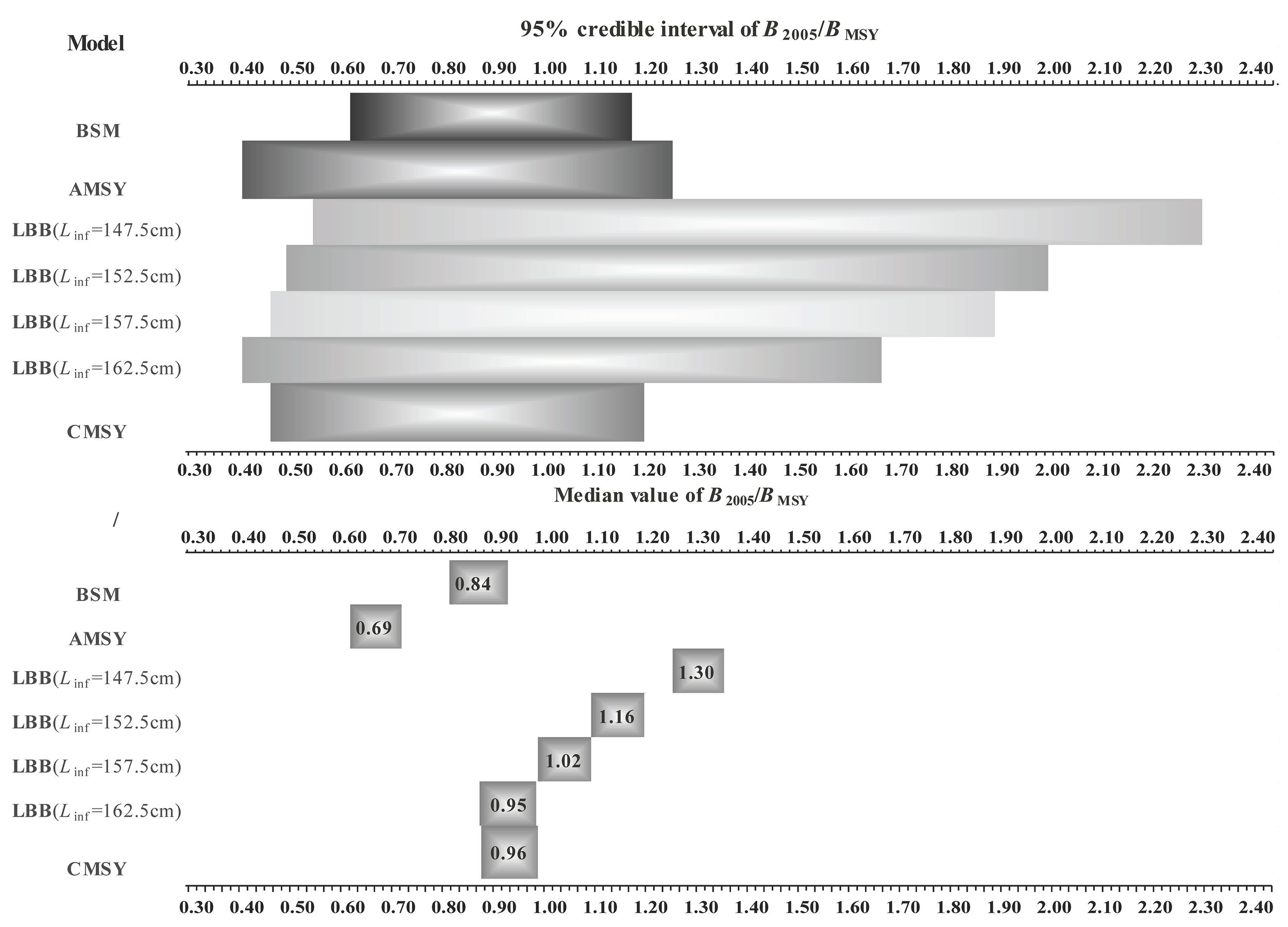 Comparison of the estimated median values, 95% credible intervals of B2005/BMSY by the four models used in this study.