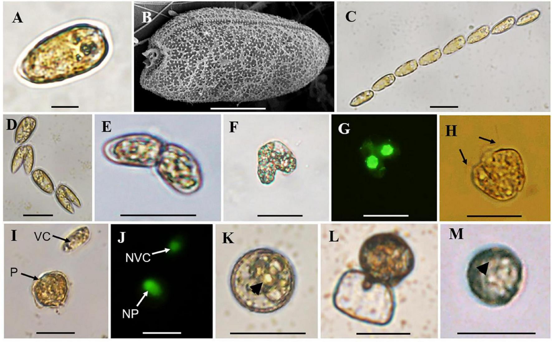 Observations of vegetative cells of Prorocentrum donghaiense, cell chain, cells in division, cell pairs in mating, planozygote, resting cysts from culture and sediment. (A,B) Vegetative cell observed by light (LM) and scanning electron microscope (SEM); (C) a cell chain with eight vegetative cells observed by LM; (D) cells in division; (E) cell pairs in mating with two apical ends connected together observed by LM; (F,G) two mating cells in fusion observed by bright field LM and green epifluorescent LM for SYBR Green-induced green nuclear fluorescence; (H) planozygote with two similar flagella (black arrows) observed by LM; (I,J) a vegetative cell (VC) and planozygote (P) and their nuclei [nucleus of vegetative cell (NVC) and nucleus of planozygote (NP)] observed by bright field LM and green epifluorescent LM for SYBR Green-induced green nuclear fluorescence; (K) round and brown resting cyst from culture with thick wall and accumulation body (black arrowhead) observed by LM; (L) a new germling releasing from the archeopyle; (M) round and brown resting cyst detected from sediment with an accumulation body (black arrowhead) with LM. Scale bars for (A) = 10 μm, (B) = 5 μm, (C–M) = 20 μm.