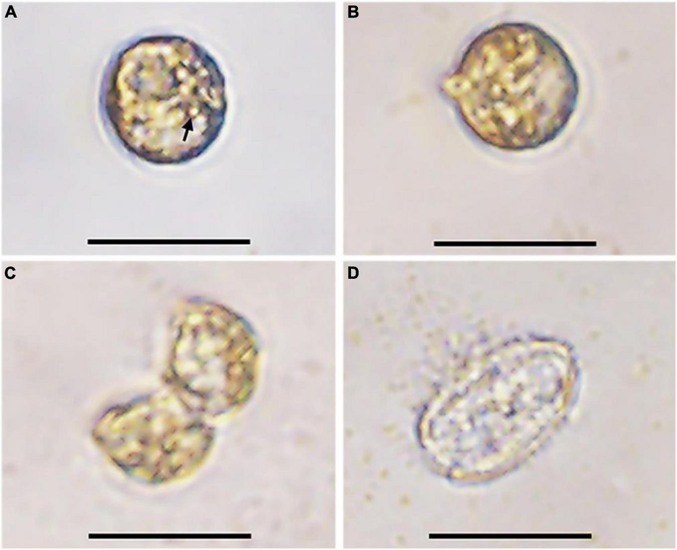 The germination experiment was conducted with the resting cysts isolated from cultures about 1-month after inoculation. During 2 weeks’ incubation, 5 of 24 resting cysts (20.8%) successfully germinated, while the others were broken during incubation. After 1 day of incubation under normal culturing conditions used to maintain cultures, the pigmentation changed and started to distribute through the cell (Figures 3A,B). On day 3, two cells connecting to each other with irregular morphology and an empty, subspherical cyst were observed, indicating a fast meiotic division for the new germling (Figures 3C,D). The morphology of archeopyle was not clearly observable due to many fine particles around the empty cyst and the small sizes of cysts. All new germling swam very fast, which made us difficult to determine whether they had one or two similar flagella.