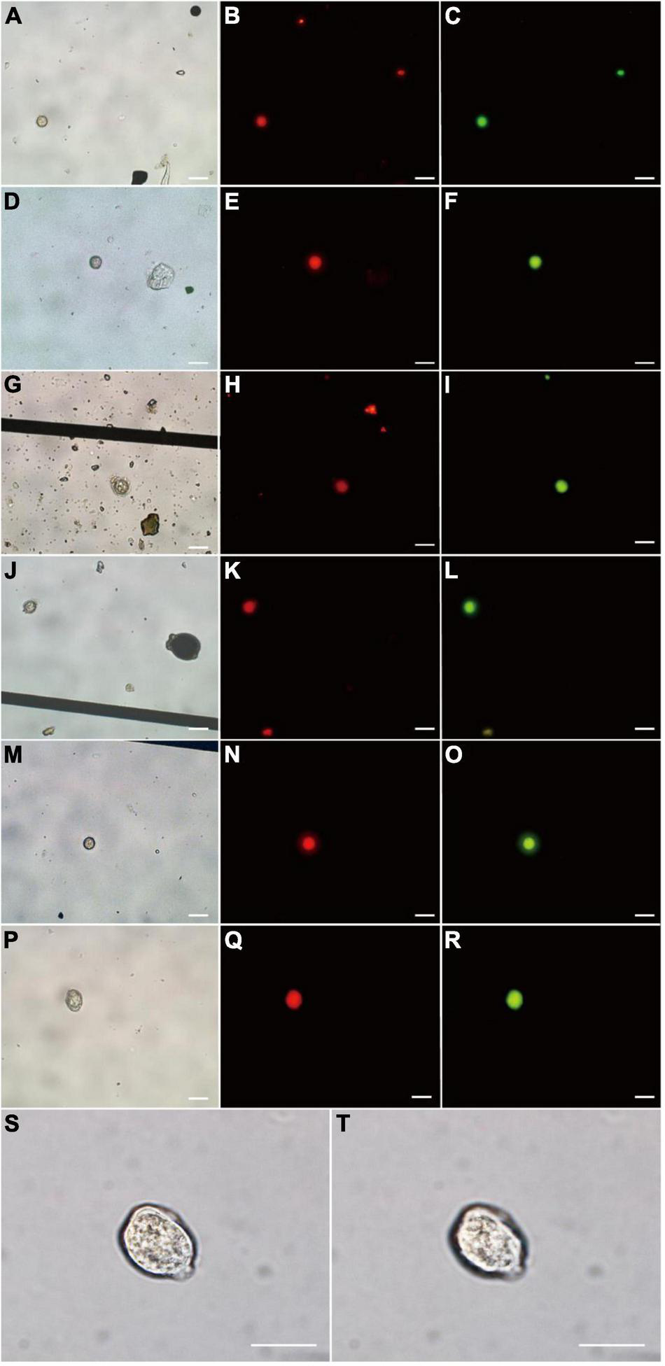 Microscopic observations of Prorocentrum donghaiense resting cysts labeled with two fluorescence signal probes simultaneously (Cy3 and FITC) in sediment. Each cyst was observed at bright field LM (A,D,G,J,M,P), orange epifluorescent LM for Cy3-labeled cysts (B,E,H,K,N,Q) and green epifluorescent LM for FITC-labeled cyst (C,F,I,L,O,R), respectively. (S,T) The cyst in (P) observed at 100× objective lens with different focusing distances. Scale bars = 20 μm.