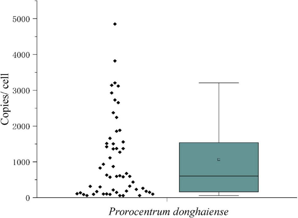 The measured mean value of LSU rRNA gene copies in a single vegetative cell was 1,519 ± 1,249 (Figure 7). Since the variation of LSU rRNA gene copy numbers may reflect that the vegetative cells were at different stages of cell cycle, the data in the inner box plot (between the upper and lower quartile) were thus considered to represent the vegetative cells at the haploid stage, which generated a copy number of 1,279 ± 483 copies per cell. Considering the diploidy of resting cysts, the LSU rRNA gene copy number in P. donghaiense resting cysts was thus estimated to be ∼2,560 copies per cyst.