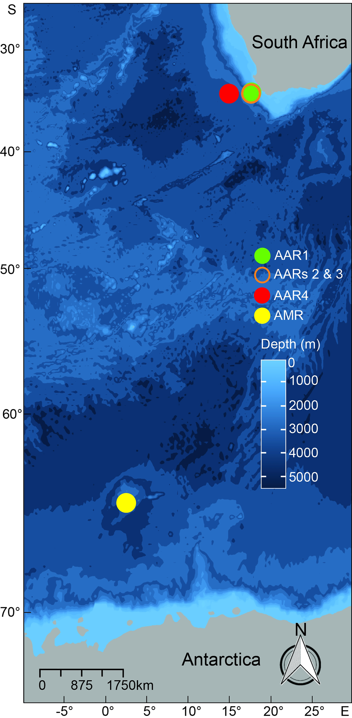 Locations of moorings with autonomous acoustic recorders (AARs) off the west coast of South Africa (AARs 1, 2, 3 and 4) and the Maud Rise, Antarctica (AMR). Shading colour of each circle, as detailed in the key, represents positions of AARs.