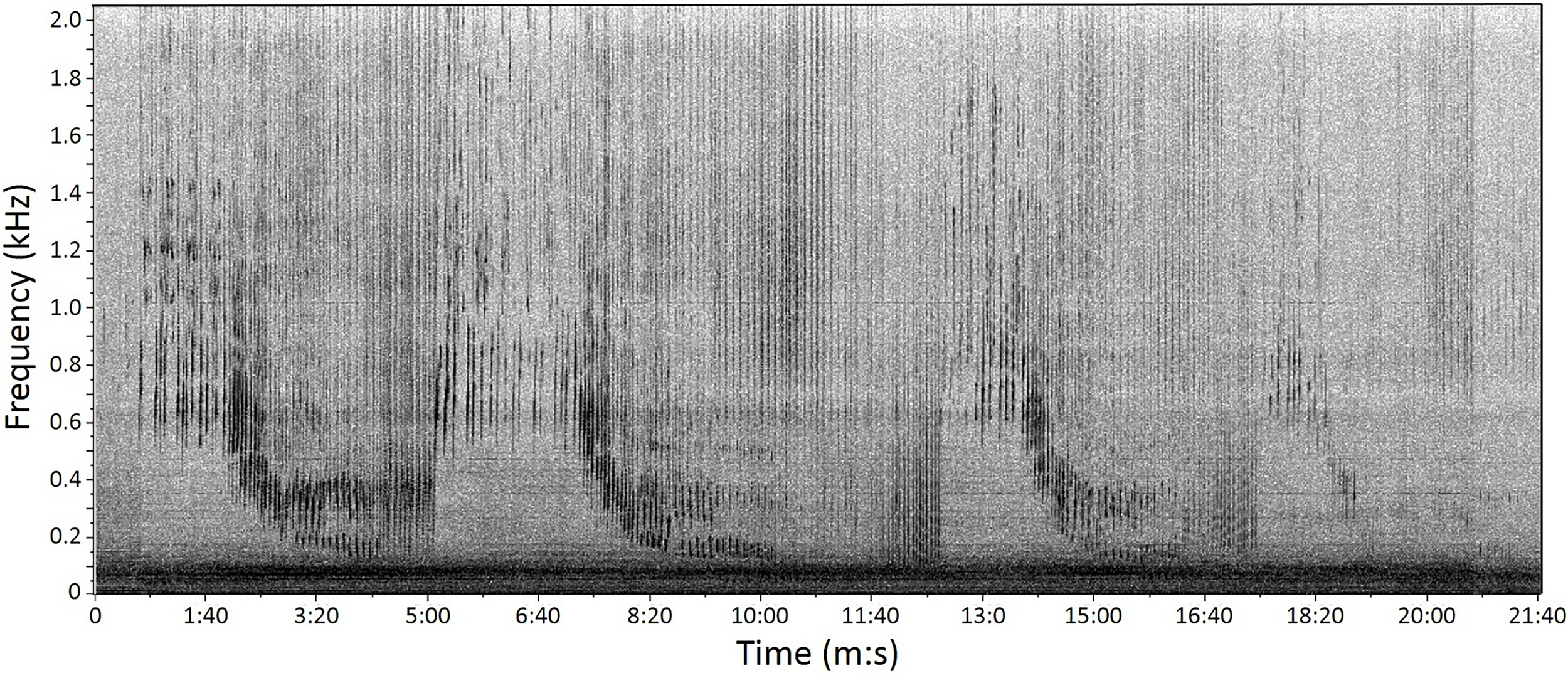 All acoustic files were reviewed by an experienced acoustic analyst (FWS) to the Nyquist frequency of each AAR recordings (1,024 Hz for AMR; 2,048 Hz for AARs 1 and 2; 4,096 Hz for AARs 3 and 4). Acoustic data were inspected via spectrogram analysis in Raven Pro (Center for Conservation Bioacoustics, 2019). The aim of acoustic analysis was to identify humpback whale vocalizations and subsequently categorized them into songs and non-songs using guidelines from published literature (e.g., Payne and McVay, 1971; Stimpert et al., 2012; Cholewiak et al., 2013; Kowarski et al., 2019). Song complexity, in terms of level of hierarchy and repetition of phrases, occurs on a spectrum ranging from the repetition of phrases and sub-phrases over minutes to five or more themes repeated in sequence for hours. To manage this spectrum of complexity, Kowarski et al. (2019) broadly divided songs into full songs, where at least three themes are repeated, and song fragments, which can be as simple as a repeated phrase. Such differentiation of full songs and song fragments can be challenging when working with duty-cycled data or faint acoustic signals and was beyond the scope of the present work. Therefore, the definition of song applied here encompasses both full songs and song fragments where any organization of units into a sequence of phrases or themes was categorized as song. Readers should be mindful of this inclusive definition when interpreting results. Vocalizations not organized into phrases or themes would have been categorized as non-songs, but acoustic signals falling within this definition were never identified. Humpback whale acoustic presence or absence was scored for each acoustic file. The time between which acoustic data were recorded demarcated the sampling session of each AAR (Table 1).