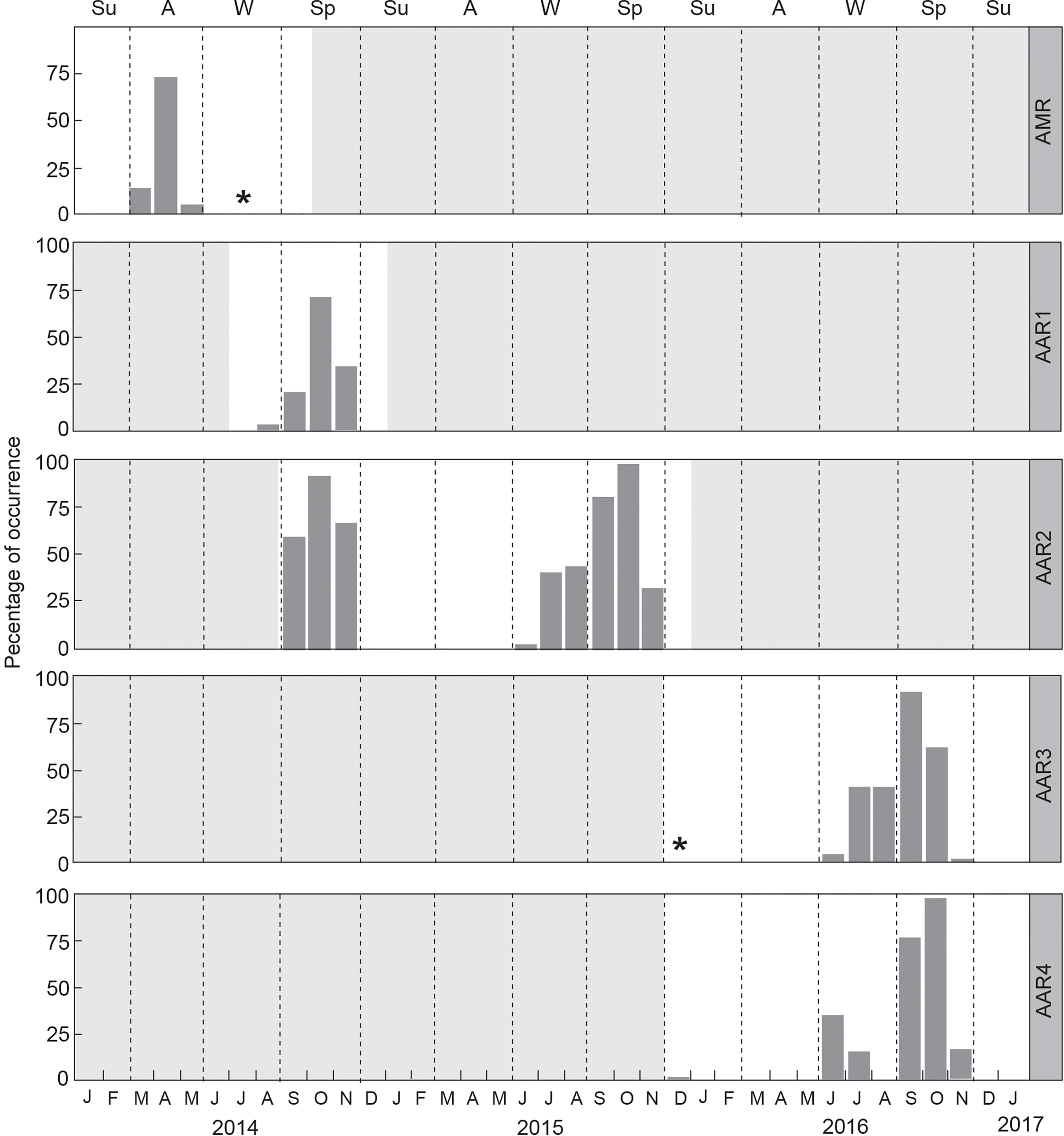 For AARs 1 and 2, the percentage of humpback whale acoustic occurrence peaked in October and were complementary during periods of recording overlap (from September through November 2014), whereas AAR3 peak in acoustic occurrence was in September 2016 (Figure 3). AAR4 had a bimodal peak of acoustic occurrence in June and October 2016 (Figure 3). Humpback whale songs were detected from late winter through spring in South African waters, and no humpback whale songs were detected from autumn until mid-winter (Figure 3). Songs were detected from August through November for AAR1. For AAR2, songs were detected from September through November in 2014 and from June through November in 2015. Songs were detected in December 2015 and from June through November 2016 for AAR3 (Figure 3). For AAR4, songs were detected in December 2015, between June and July, and from September through November in 2016. The seasonal occurrence of songs did not change inter-annually between AARs 2 and 3 that were deployed on the same location (Figure 3).