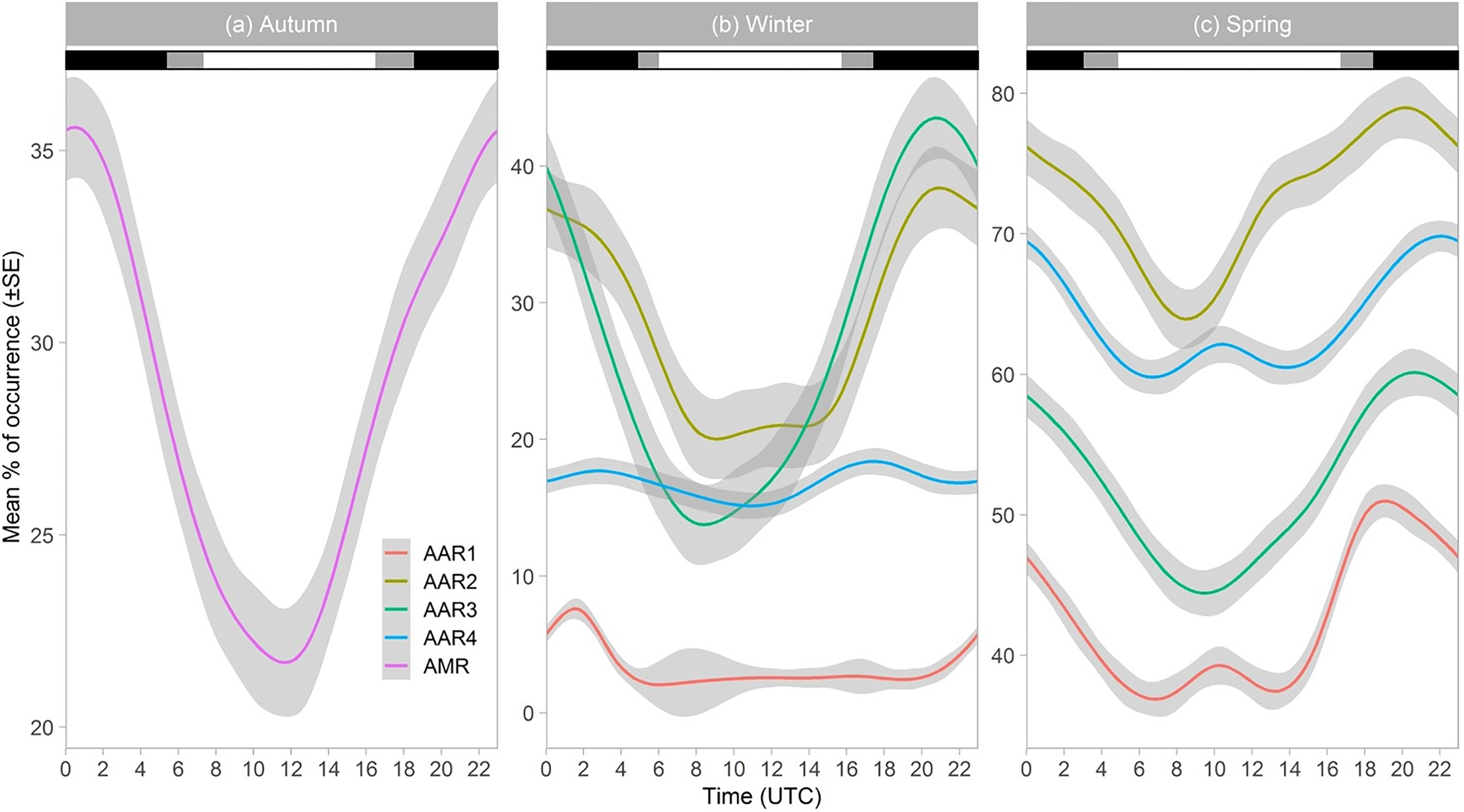 Diel percentage of acoustic occurrence per season for humpback whales off the west coast of South Africa (AARs 1, 2, 3 and 4) and Maud Rise, Antarctica (AMR). Note different y-axes scales. Horizontal bar shadings indicate daylight regime: black represents the average nighttime hours; grey represents average twilight hours; white represents average daytime hours. Grey shading around line plots indicates the standard error (SE). Autumn daylight regime is from the Maud Rise since there was no pattern for South African waters, and remaining daylight regimes are from South African waters since there was no presence data for the Maud Rise. Coordinated Universal Time (UTC) is used.