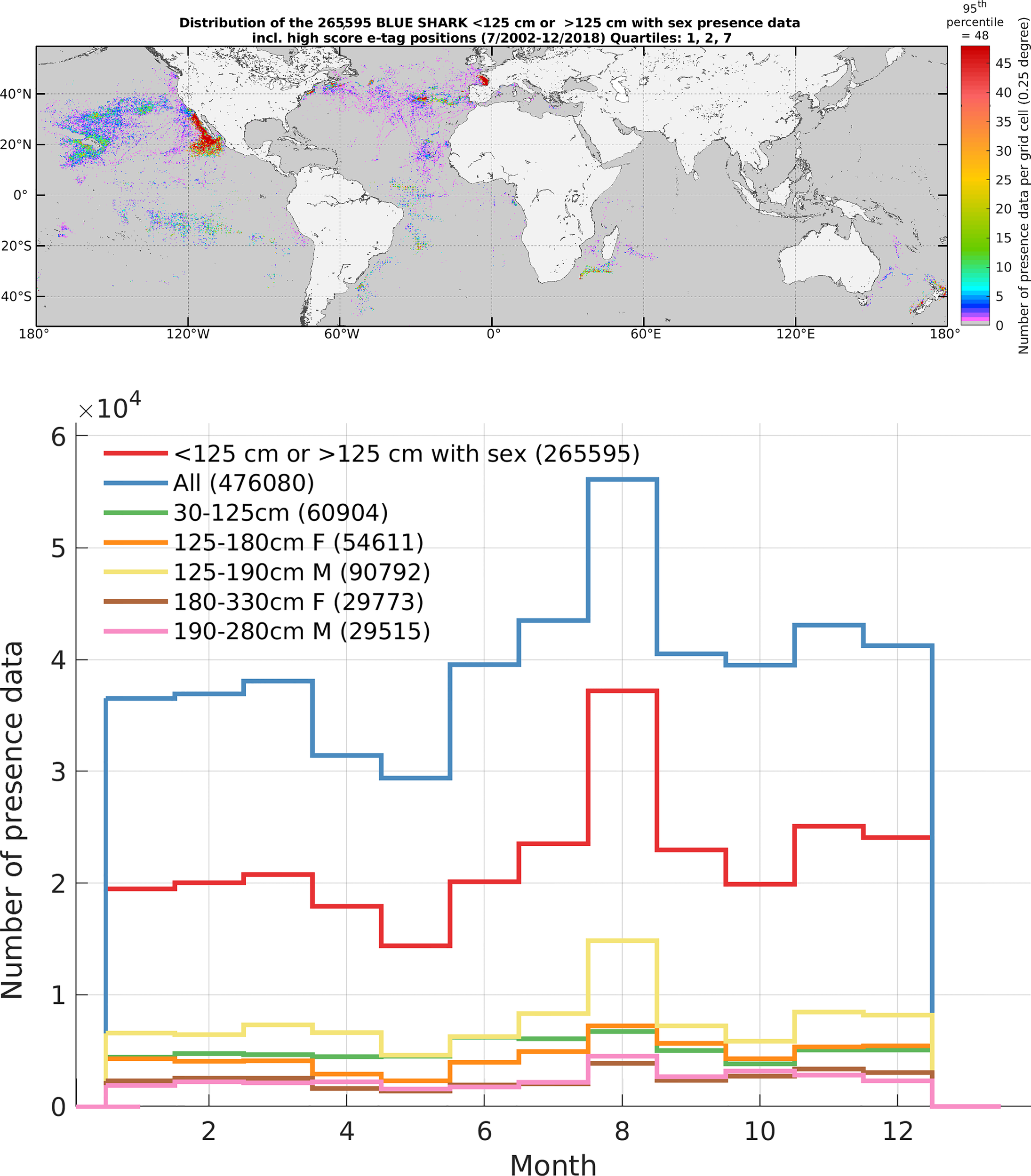 Distribution of both calibration and validation presence data (FL < 125 cm and FL > 125 cm with sex information, upper map, n = 265,595, number of presence data per grid cell of 0.25°), and monthly distribution by size and sex class (‘All’ corresponds to all presence data contemporary to environmental data independently of size and sex availability). These data are mainly derived from fisheries observer (94.5%) programs, but include a small amount of data from electronic tags (one position per day of higher accuracy, 5.5%). See in Supplementary Material the Figures SM.1-5 on the distributions by size and sex classes, and seven video animations of habitat in regions of high-density electronic tagging data.