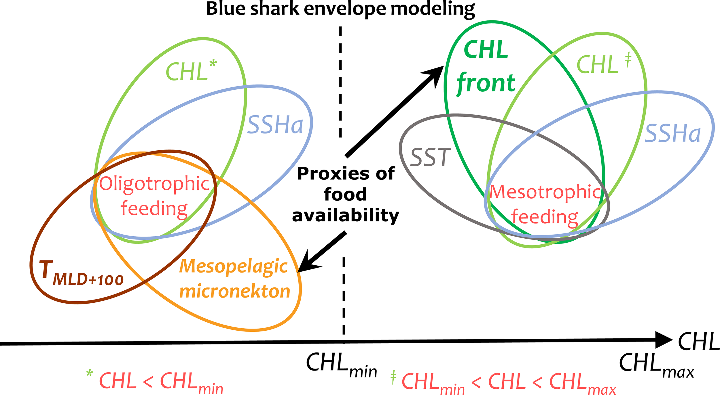Scheme of the blue shark envelope modeling linking the environmental variables in oligotrophic (CHL < CHLmin) and mesotrophic (CHLmin < CHL < CHLmax) environments with mesopelagic micronekton and productivity fronts (chlorophyll-a horizontal gradients) as foraging proxies, respectively. The abiotic variables (SST, Tmld+100 and SSHa) were used to exclude unsuitable environments. CHL, surface chlorophyll-a content; SST, sea surface temperature; Tmld+100, Temperature 100 m below the mixed layer depth; SSHa, sea surface height anomaly.