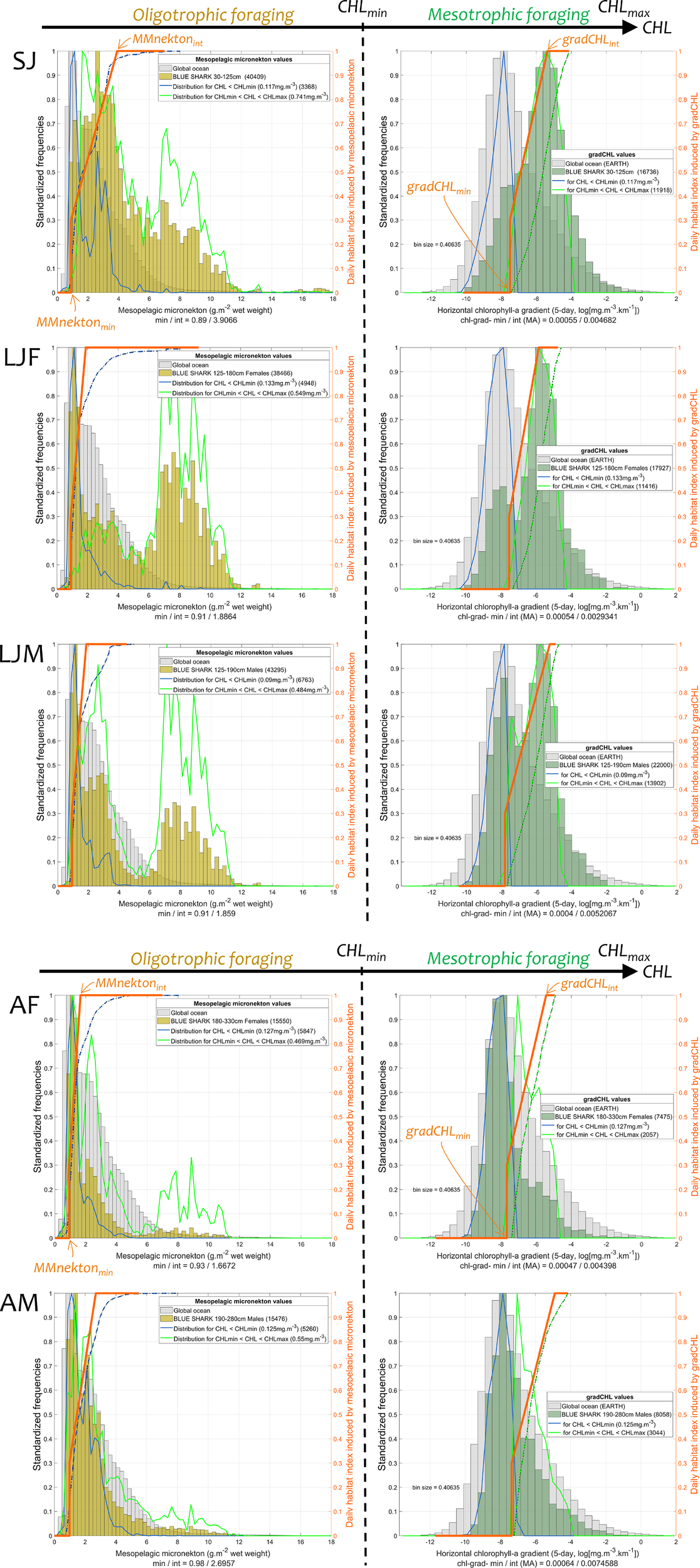 Frequency of blue shark presence in each foraging proxy (colored histograms, relative units) and identification of the respective daily linear function of foraging habitat (orange line segment). The distribution of mesopelagic micronekton (oligotrophic foraging, the colored histogram on left panels; MMnekton; g.m-2 wet weight) and chlorophyll-a gradient (mesotrophic foraging, the colored histogram on the right panels; gradCHL; log-transformed, mg.m-3.km-1) at the location of blue shark presence data by size and sex classes (SJ, LJF, LJM, AF, and AM) are compared to the global ocean distribution (light grey histogram). The distribution of MMnekton and gradCHL at the location of blue shark presence and for CHL < CHLmin and CHLmin < CHL < CHLmax, respectively, are delineated by the blue and green lines. The maximum slope of the cumulative distribution of blue shark presence for each foraging proxy (blue and green dashed line for MMnekton and gradCHL, respectively) defines the slope of the daily habitat linear function (orange line; see also Table 1; also using MMnektonmin and gradCHLmin).