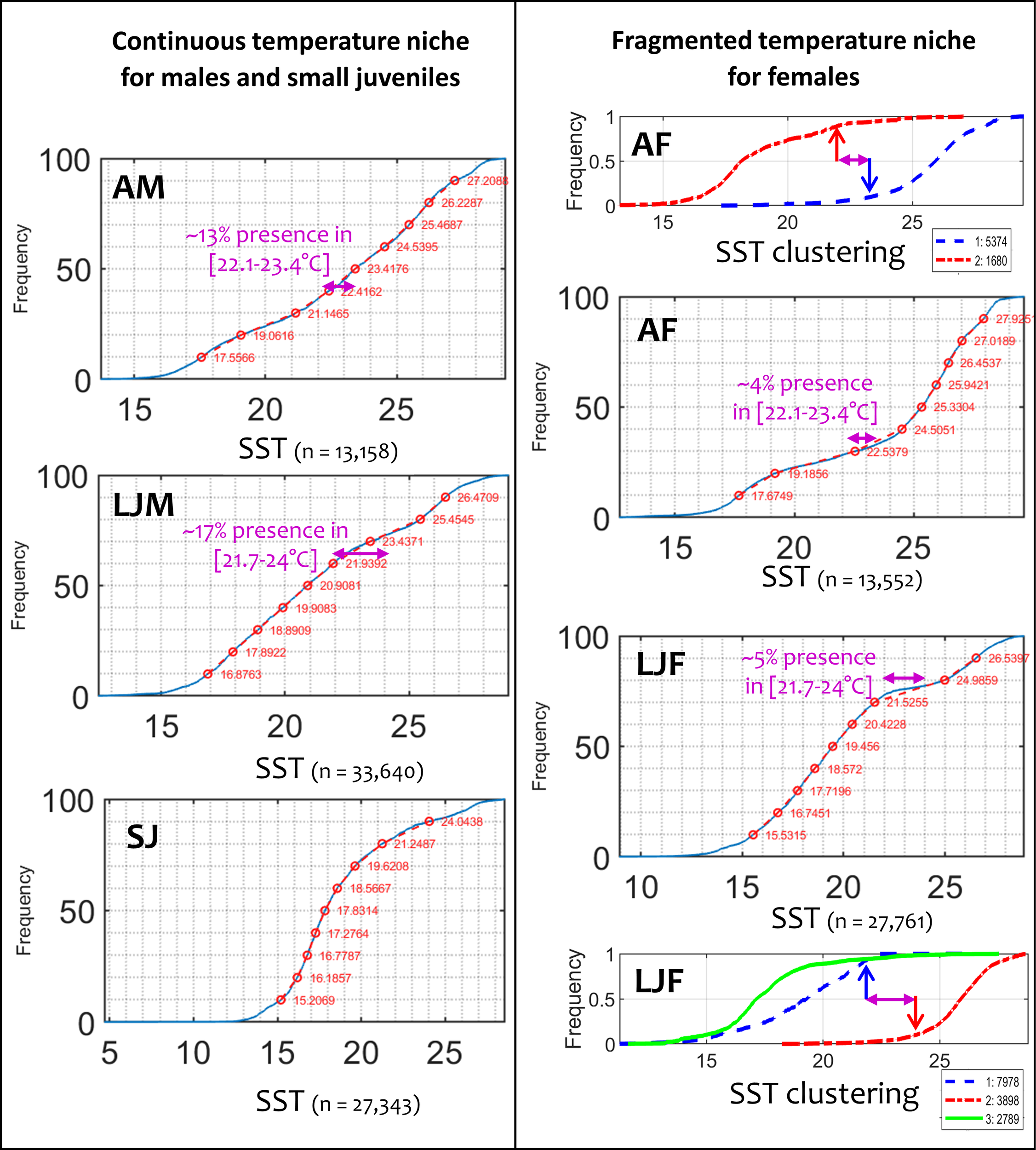 Global distribution of sea surface temperature (SST) by size and sex class of blue shark. A continuous SST niche for males and small juveniles (left panels) and a fragmented SST niche for large juvenile and adult females (right panels) is evident, with three to four-fold lower presence of females than males in the SST range of 21.7-24°C and 22.1-23.4°C, respectively.