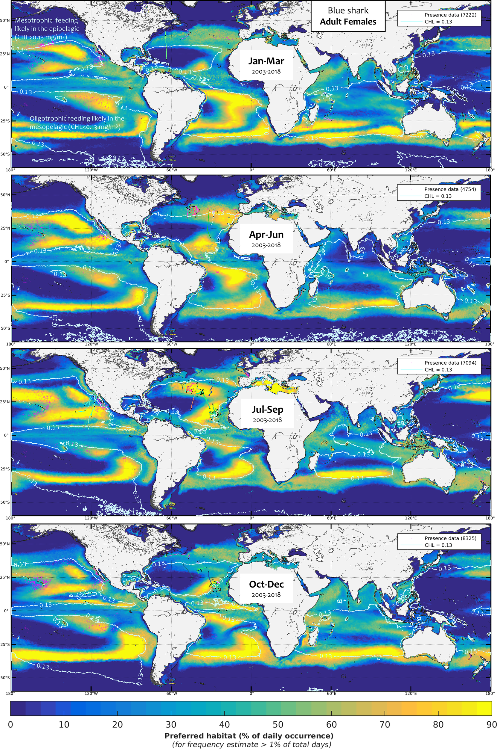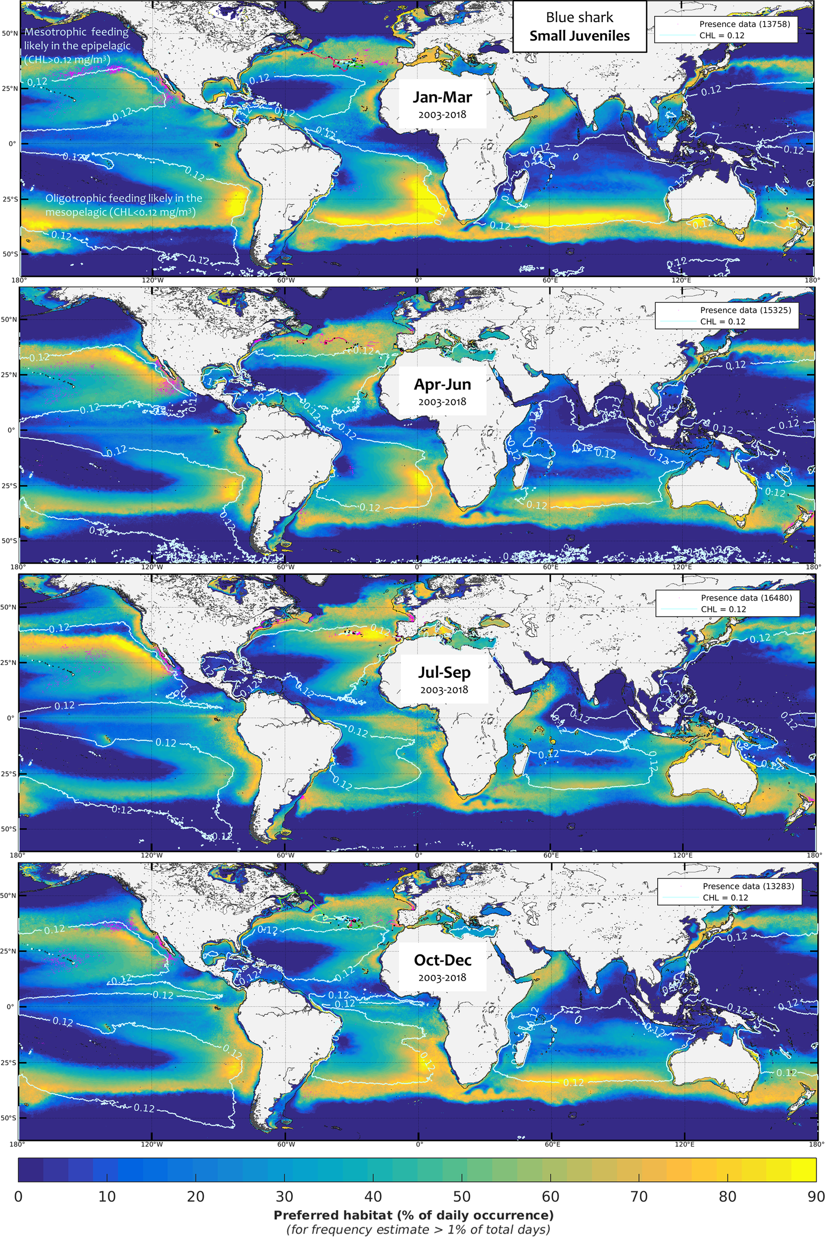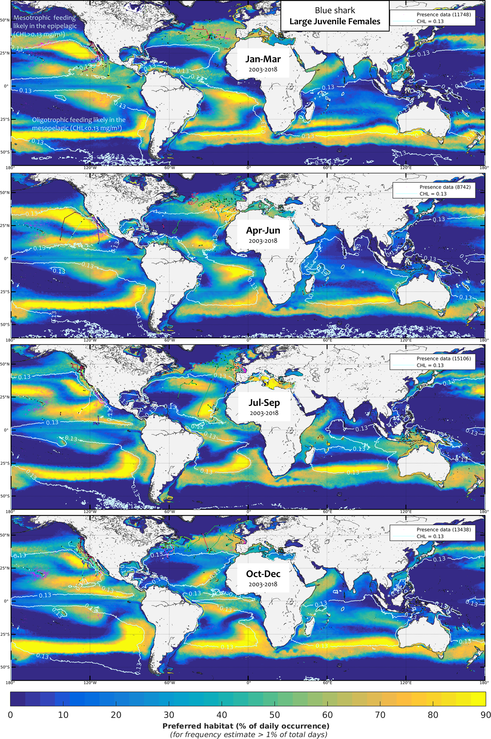 We used the favorable foraging conditions of blue sharks for each class as defined by the model calibration to extrapolate daily global blue shark habitat. The mean seasonal foraging habitat by size and sex class for the period 2003-2018 was computed using monthly mean levels (Figures 5–9, see also Figure SM.6 for data integration and the seven habitat animations with the overlay of electronic tagging and observer data as separate SM). The frequency of suitable habitat occurrence (%) differed primarily among seasons and the five blue shark classes. We plotted the chlorophyll-a isocontour of CHLmin on each map to distinguish the distribution of foraging habitat arising from the mesopelagic micronekton (oligotrophic) and productivity front (mesotrophic) proxies (CHL < CHLmin and CHLmin < CHL < CHLmax, respectively). Oligotrophic environments tend to contain higher levels of suitable foraging habitat as compared to mesotrophic areas. This notably reflects the more stable estimated levels of mesopelagic micronekton compared to the scattered frequency of productivity fronts occurring in mesotrophic areas. Favorable conditions for oligotrophic foraging occur for all classes in the central part of the large subtropical gyres, although not in the most oligotrophic areas (see, e.g., the habitat differences between the subtropical northeast and poorer southeast Pacific, Figures 5-9). Instead, mesotrophic foraging mostly arises in temperate and equatorial latitudes, both of which display a seasonal contraction during the cold months alternately in both hemispheres, resulting in a latitudinal oscillation between the seasons in the equatorial area.