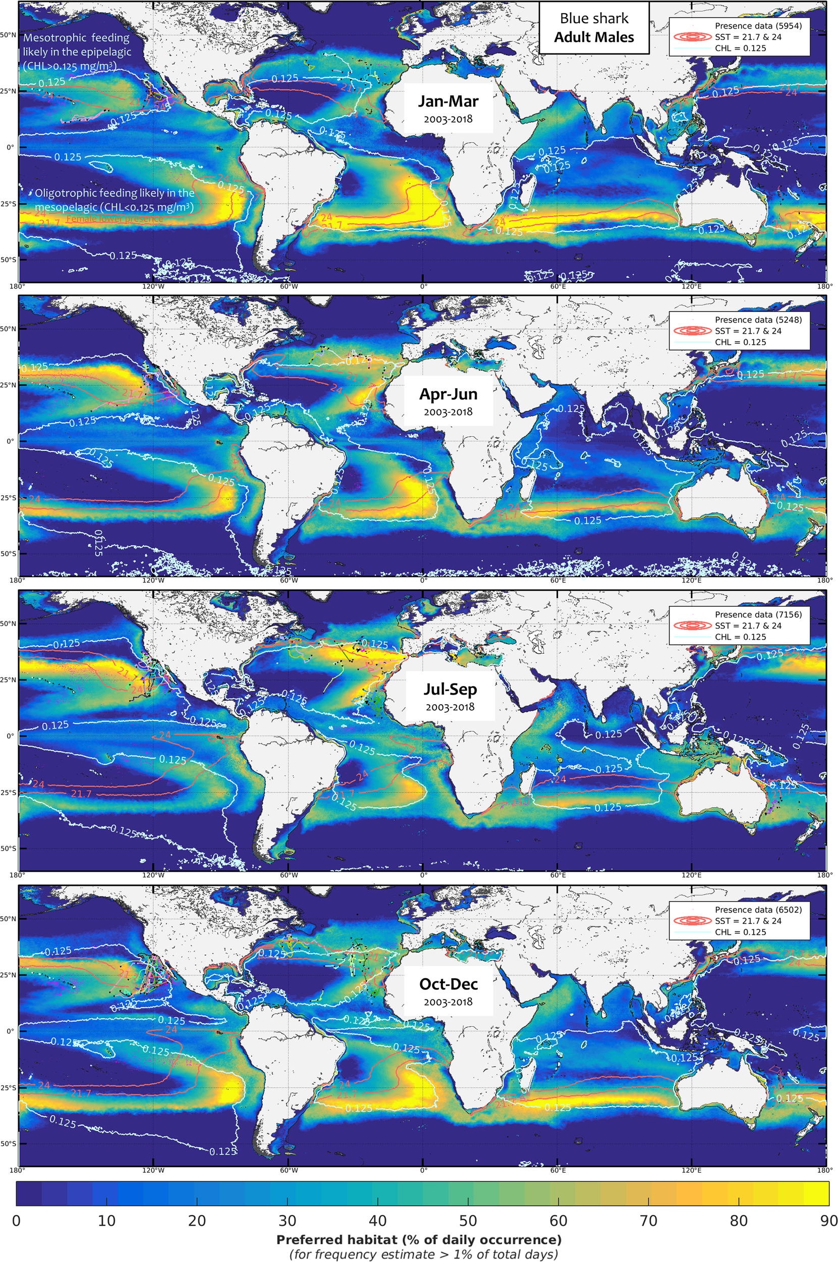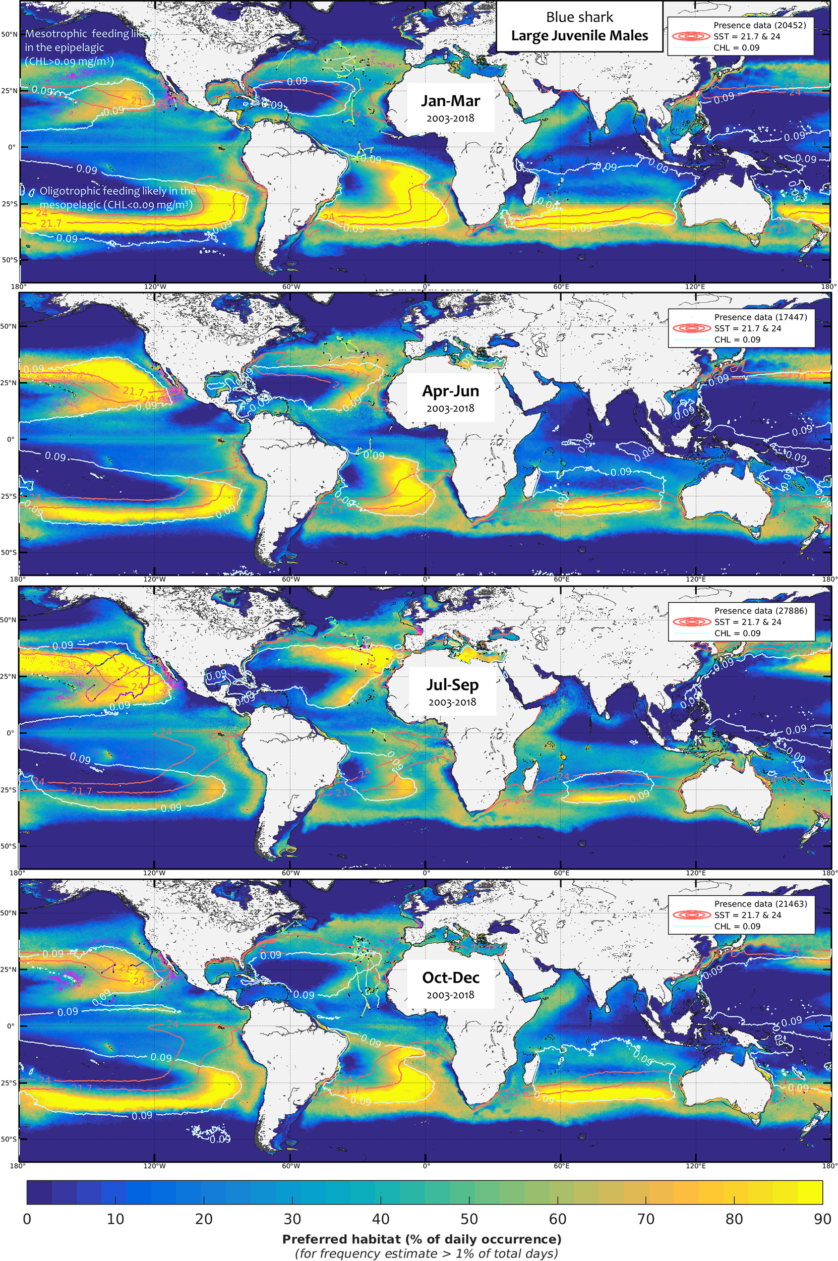 Another limitation of the habitat model relates to the comparability of both foraging proxies. Large scale analysis of habitat quality is difficult because blue sharks modify their strategy over their lifespan, from more frequent foraging in relatively cold and mesotrophic waters (likely in the epipelagic layer) as a small juvenile, to less frequent and deeper foraging in relatively warm surface waters (likely in the mesopelagic layer) as an adult. Thus, habitat values do not represent absolute levels of foraging capacity in that they are not comparable in oligotrophic (micronekton, CHL < CHLmin) or mesotrophic conditions (CHL gradient, CHLmin < CHL < CHLmax). In other words, oligotrophic daily habitat values may reach the maximum value of 1 even if the foraging capacity is functionally much lower than in mesotrophic environments. Small juveniles and adults are both adapted to foraging in relatively productive/cold and poor/warm niches, respectively, to meet their energetic needs. This means that the habitat suitability represents both the foraging capacity within each proxy and the energetic needs of individuals. These characteristics of balanced energy intake and expenditure should be kept in mind when interpreting the habitat results. It should be further noted that the scaling of both foraging proxies was done independently from one another using the respective cumulative distribution functions of presence.