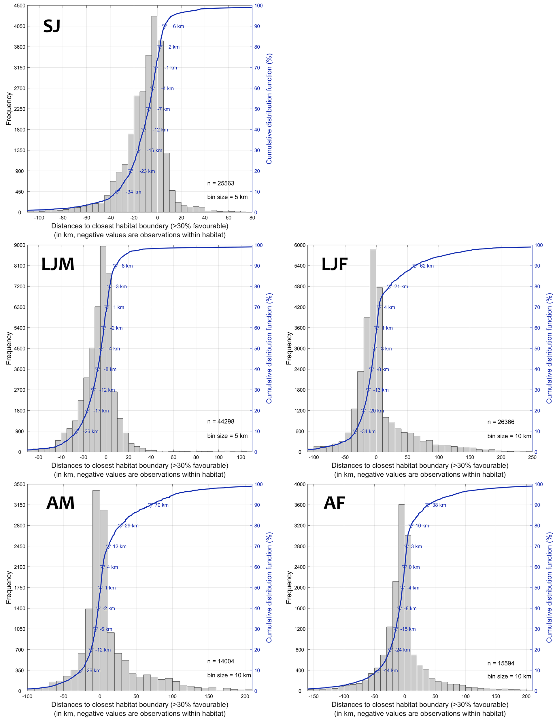 Model performance estimated in distances (km) of validation presence data to closest core habitat boundary (above 30% favorable) for each size and sex class (SJ, LJF, LJM, AF, and AM) and corresponding cumulative distribution showing distance values for each decile bin of presence data (negative are observations within favorable habitat). For the SJ class for instance, 74% of validation presence data were within the core habitat (above 30%) and the distance of the 80th percentile of presence data to the closest core habitat boundary was 2 km (n = 25,563).