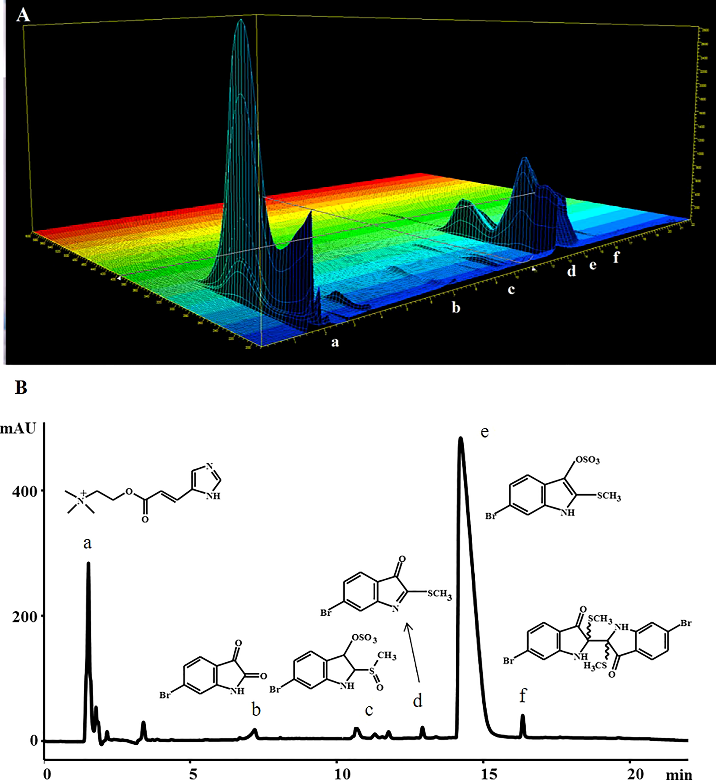 | Tyriverdin | 6-bromo-2-(6-bromo-2-methylsulfanyl-3-oxo-1H-indol-2-yl)-2-methylsulfanyl-1H-indol-3-one | C18H14Br2N2O2S2 | Brominated indole derivative | 16.4 min | 535, 537, 538 [M+Na]+ |