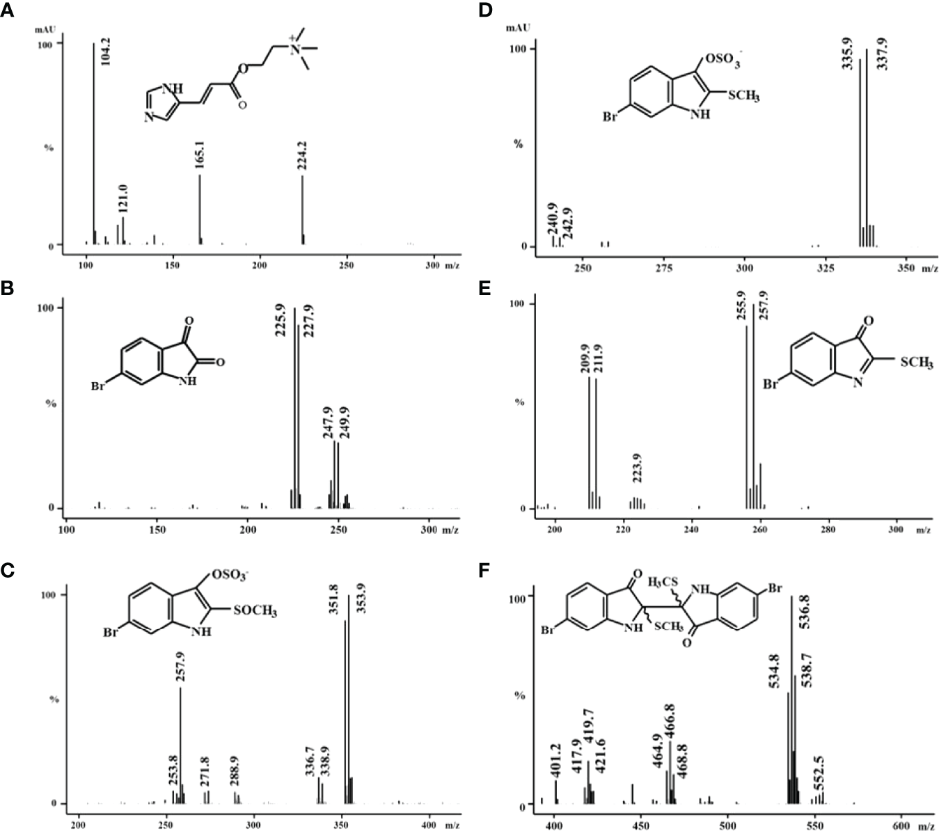 Representative mass spectra of the secondary metabolites obtained from ethanol extracts from the hypobranchial gland of Dicathais orbita(A) murexine, (B) 6-bromoisatin, (C) tyrindoxyl S-oxide sulphate, (D) tyrindoxyl sulphate, (E) tyrindoleninone, and (F) tyriverdin.