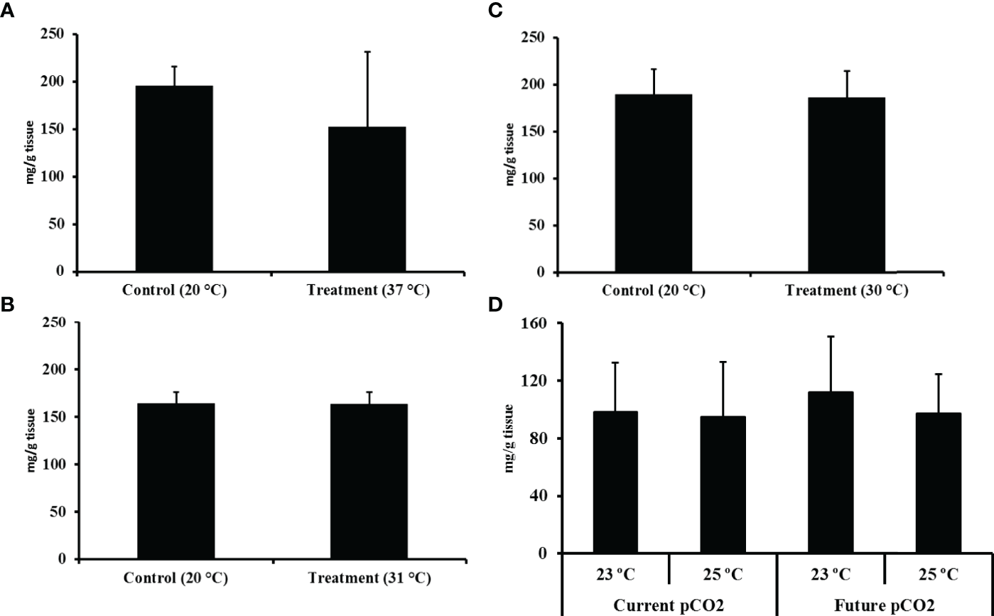 Total yield in mg/g (mean % ± SD) of the ethanol extracts from the hypobranchial gland of Dicathais orbita: (A) Critical thermal maxima (CTMax) short-term, fast warming rate; (B) CTMax long-term, slow warming rate; (C) 7 day static heat stress; and (D) the 35 day ocean climate change experiment.