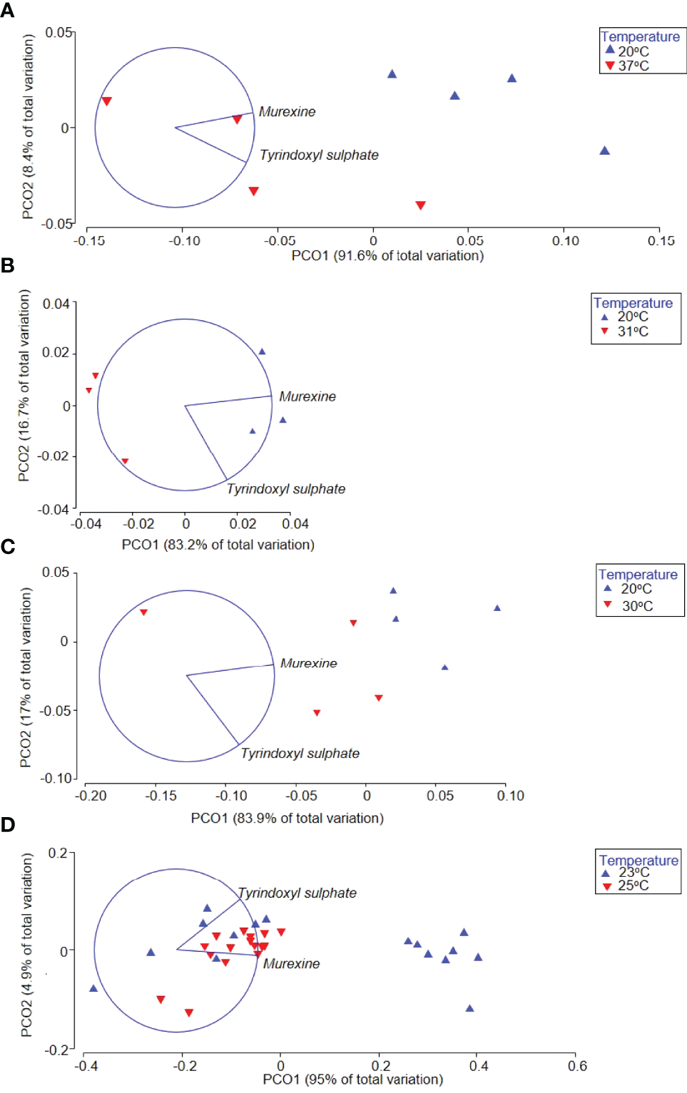 Principal component ordination (PCO) based on a Euclidian distance similarity matrix on the secondary metabolite composition from the hypobranchial gland of Dicathais orbita, with vector overlay from Pearson correlation > 0.9. (A) Critical Thermal Maxima (CTMax) short-term fast warming rate with temperature increment of 1°C/1 h; (B) Critical Thermal Maxima (CTMax) longer-term with slow warming rate temperature increment of 1°C/12 h; (C) 7 day static heat stress; and (D) 35 day ocean climate change experiment.
